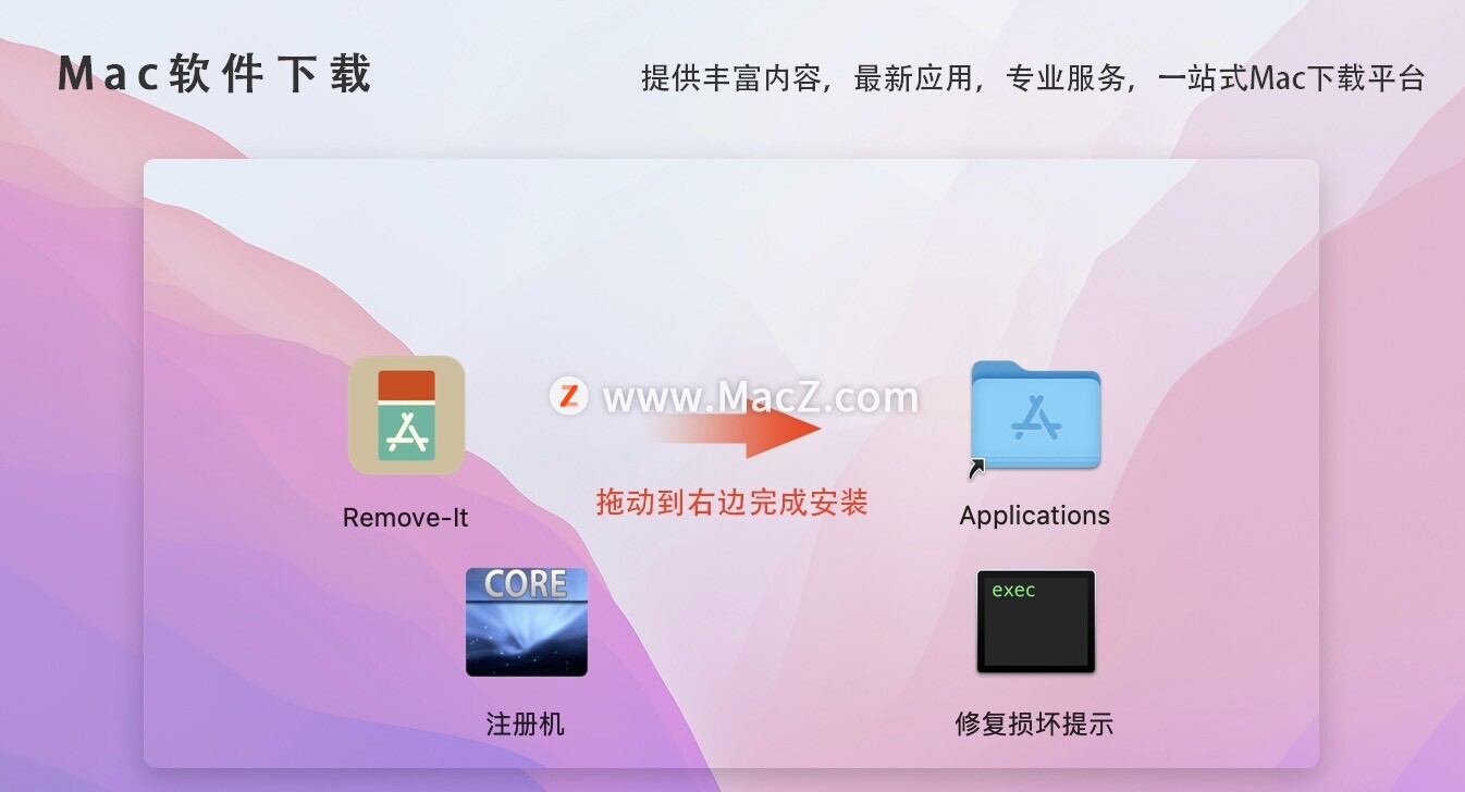 安装包下载完成后打开,拖动左侧的Remove-It到右侧应用程序中