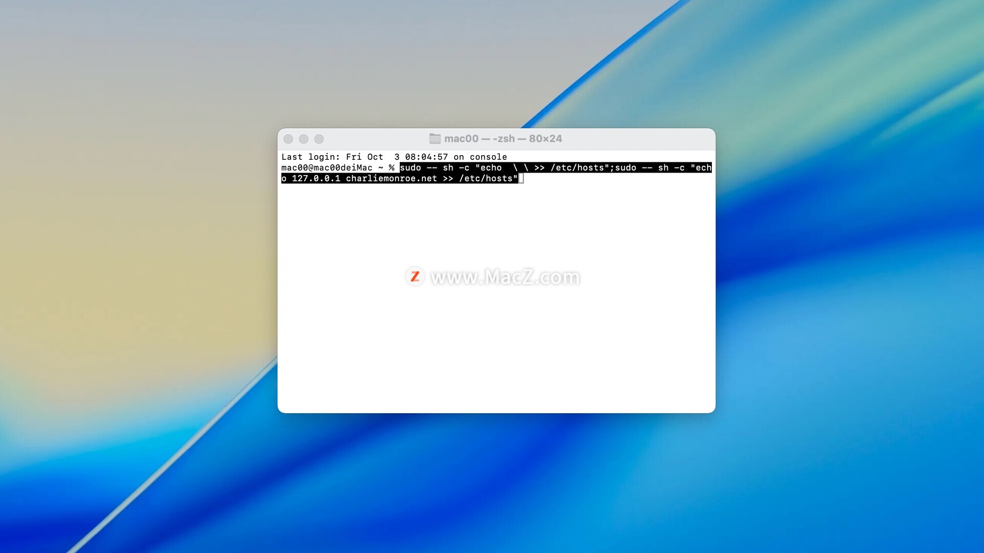 sudo -- sh -c "echo \ \ >> /etc/hosts";sudo -- sh -c "echo 127.0.0.1 software.charliemonroe.net >> /etc/hosts"