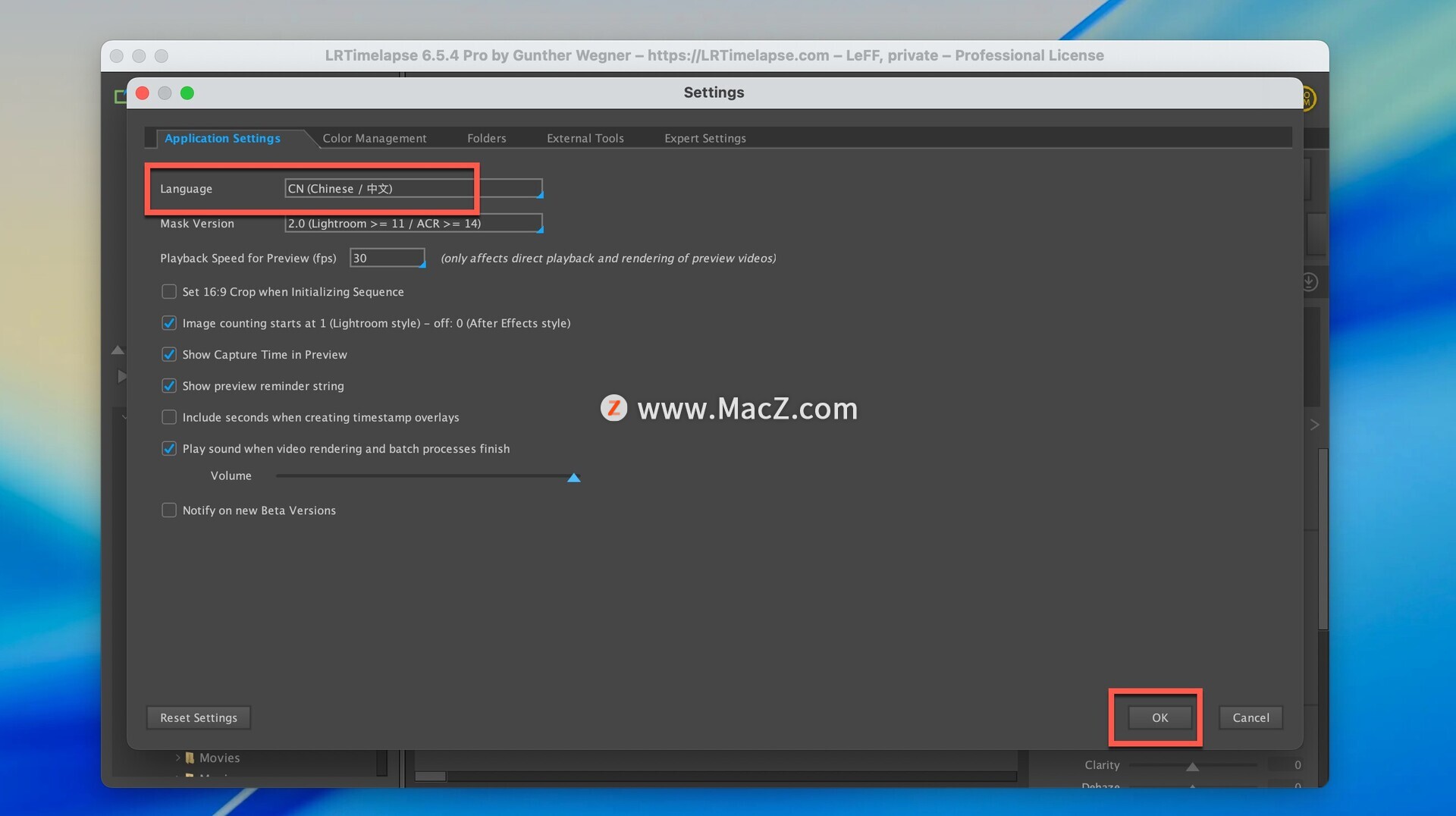 汉化教程运行lrTimelapse,选择Setting..打开菜单栏设置