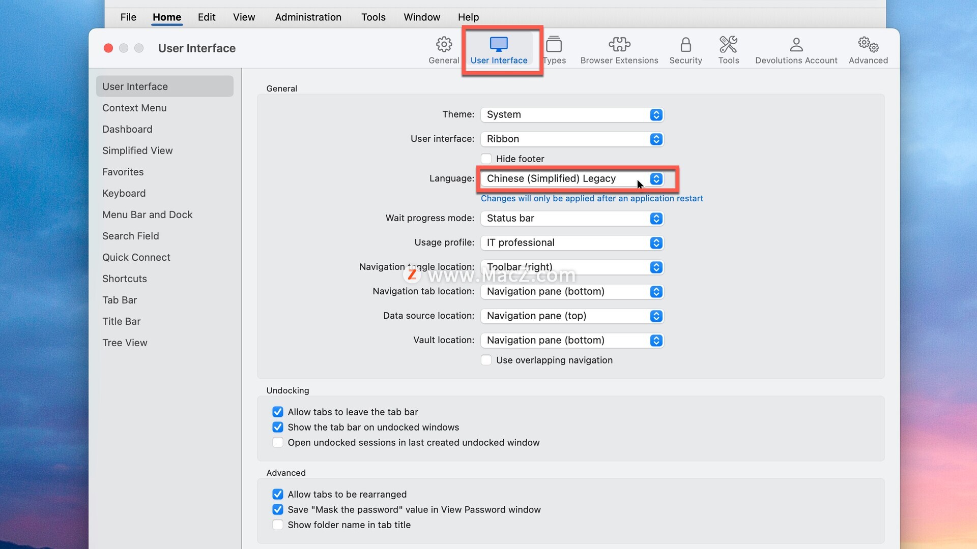 在User Interface一栏选择Chinese...,然后重新运行软件即可开始使用remote desktop manager for mac 中文版了,如下图:
