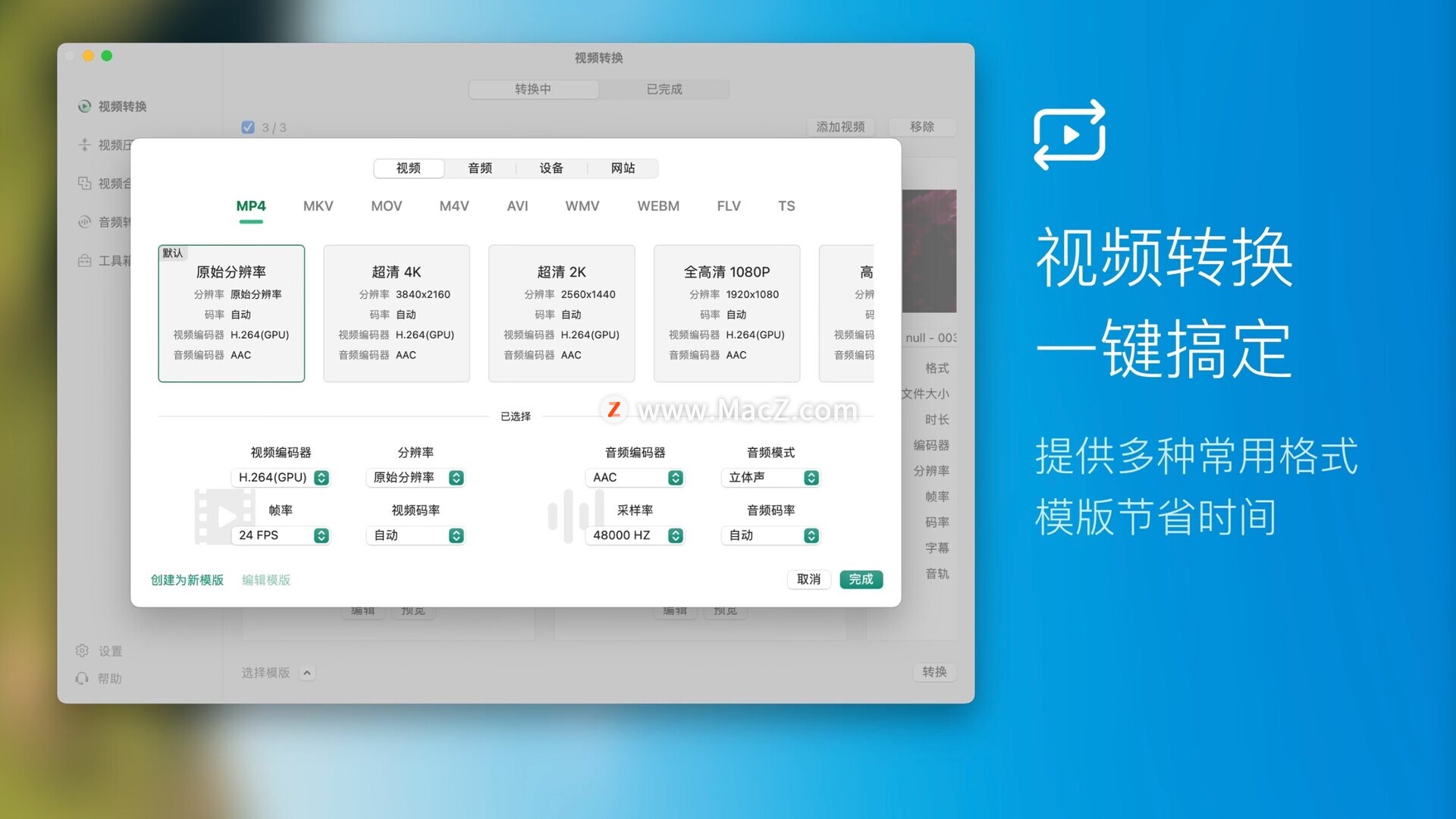 - 支持常用网站和应用格式 内置针对微信、哔哩哔哩、Facebook、Instagram、Youtube优化的视频格式模板,一键转换操作。