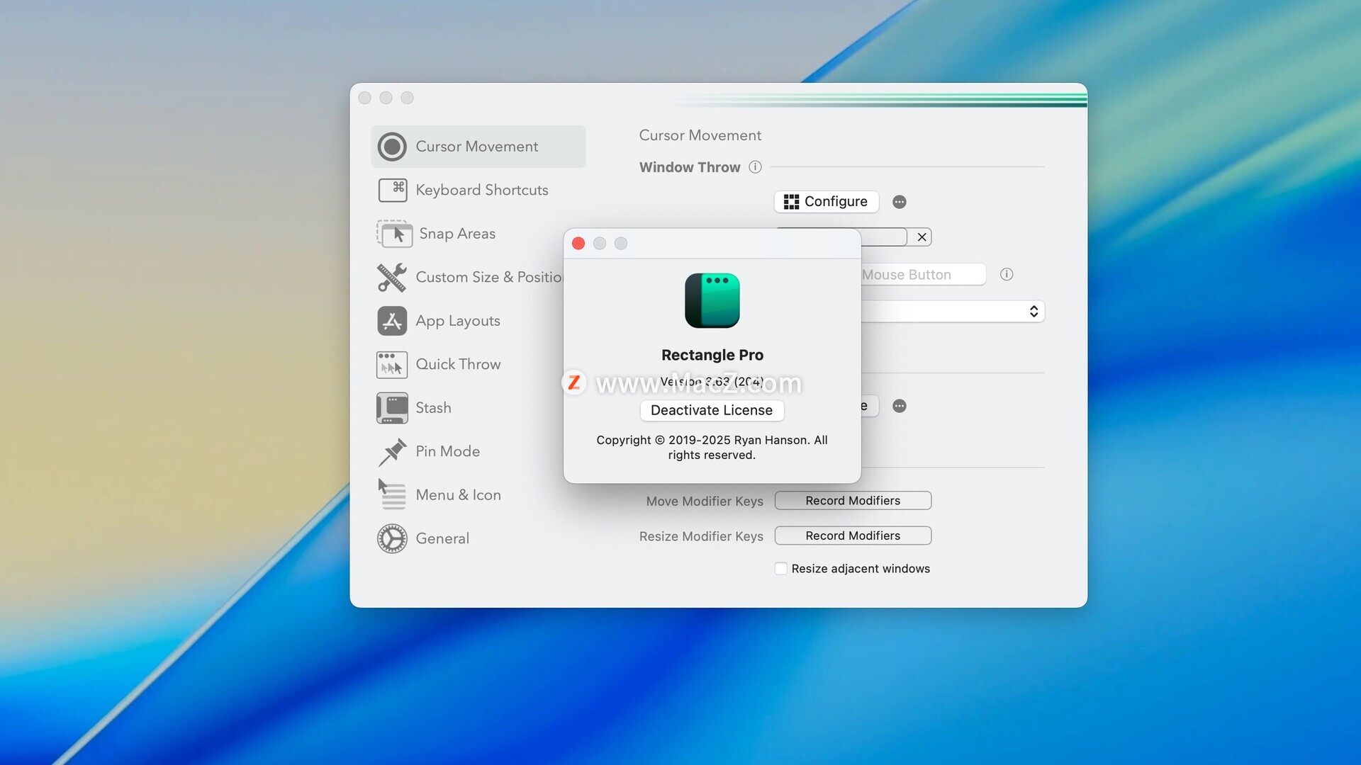 Rectangle Pro 是一款Mac窗口管理工具,帮助用户快速调整窗口的布局,提高工作效率。该工具支持多种窗口布局模式,包括居中、最大化、左右分屏、上下分屏、四分屏等。用户可以自定义快捷键,快速切换不同的布局模式。除了窗口布局,Rectangle Pro 还支持窗口移动、缩放、调整大小等操作,可以通过鼠标或键盘快捷键实现。另外,Rectangle Pro 还支持多显示器环境,可以在不同的显示器上独立管理窗口布局。该工具还提供了一些高级功能,如自定义布局、应用程序窗口管理等,方便用户进行个性化设置。测试环境:MacOS 15.0