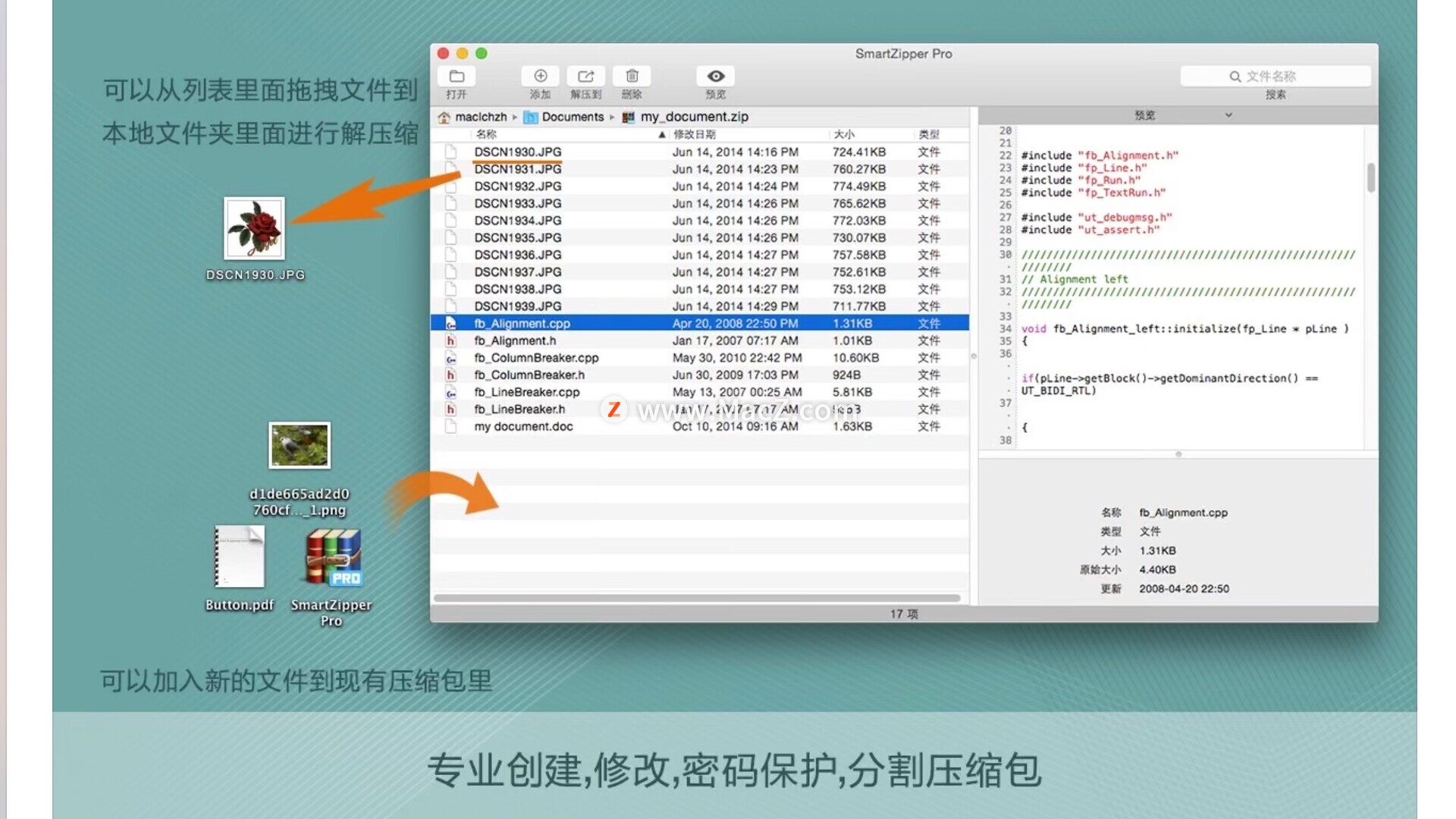 SmartZipper for Mac是一款易于使用且高效的压缩和解压缩工具,特别适用于Mac平台。它支持处理多种压缩格式,如RAR、7z、ISO、CAB、Zip、Lzma、Tar、Gzip和Bzip2等。这款软件可以迅速完成压缩和解压缩任务,从而节省用户的时间和电脑存储空间。