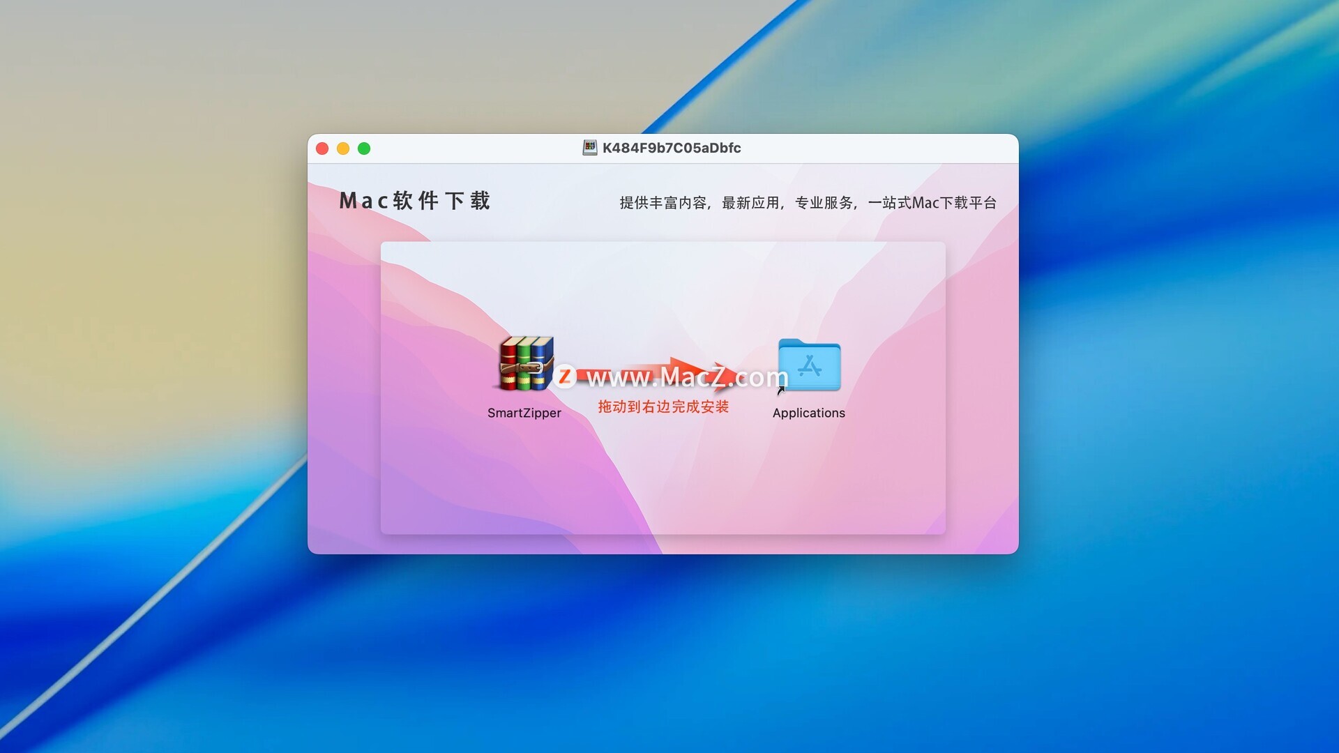 安装包下载完成后打开,拖动左侧的SmartZipper 到右侧应用程序中即可