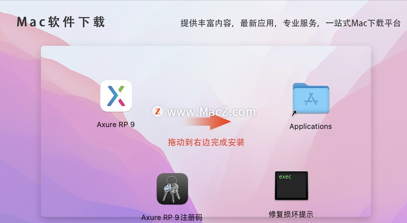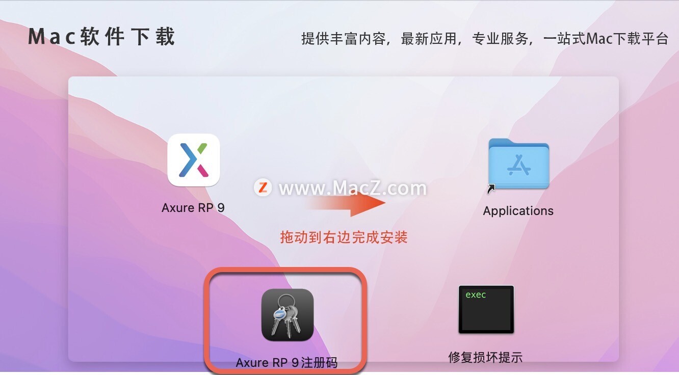 注意!需要在断网下激活注册!!!软件包下载完成后打开,将左边的Axure RP 9拖动到右边的应用程序中
