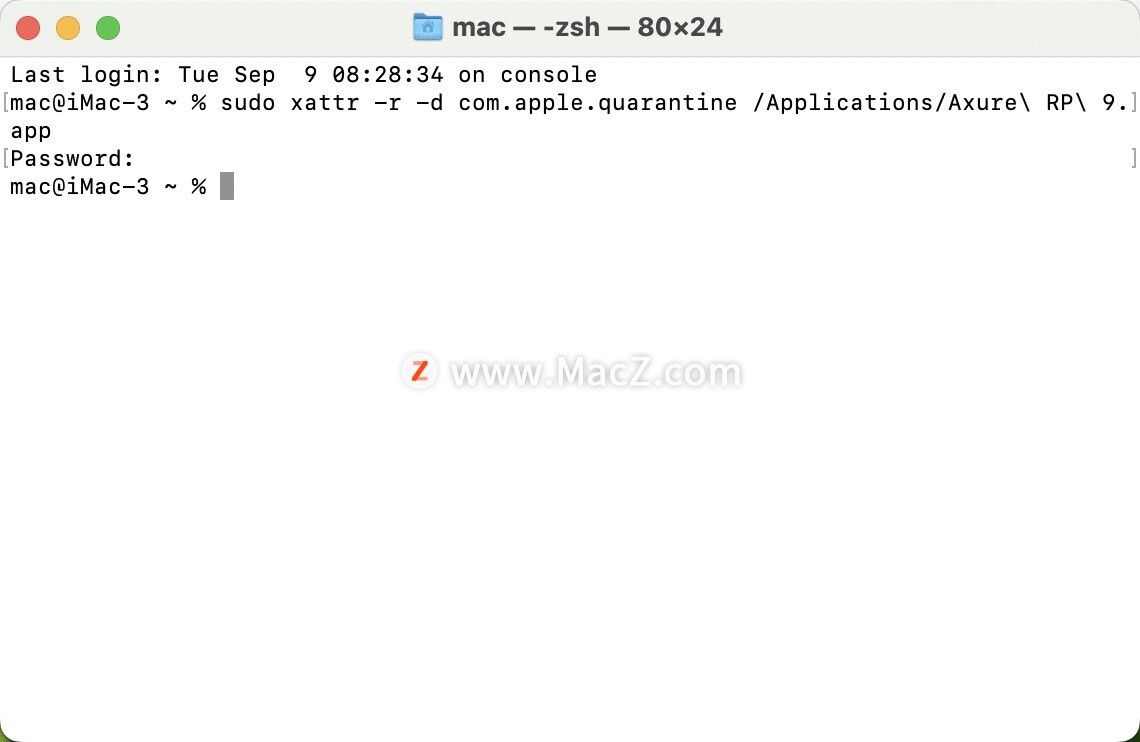 sudo xattr -r -d com.apple.quarantine /Applications/Axure\ RP\ 9.app