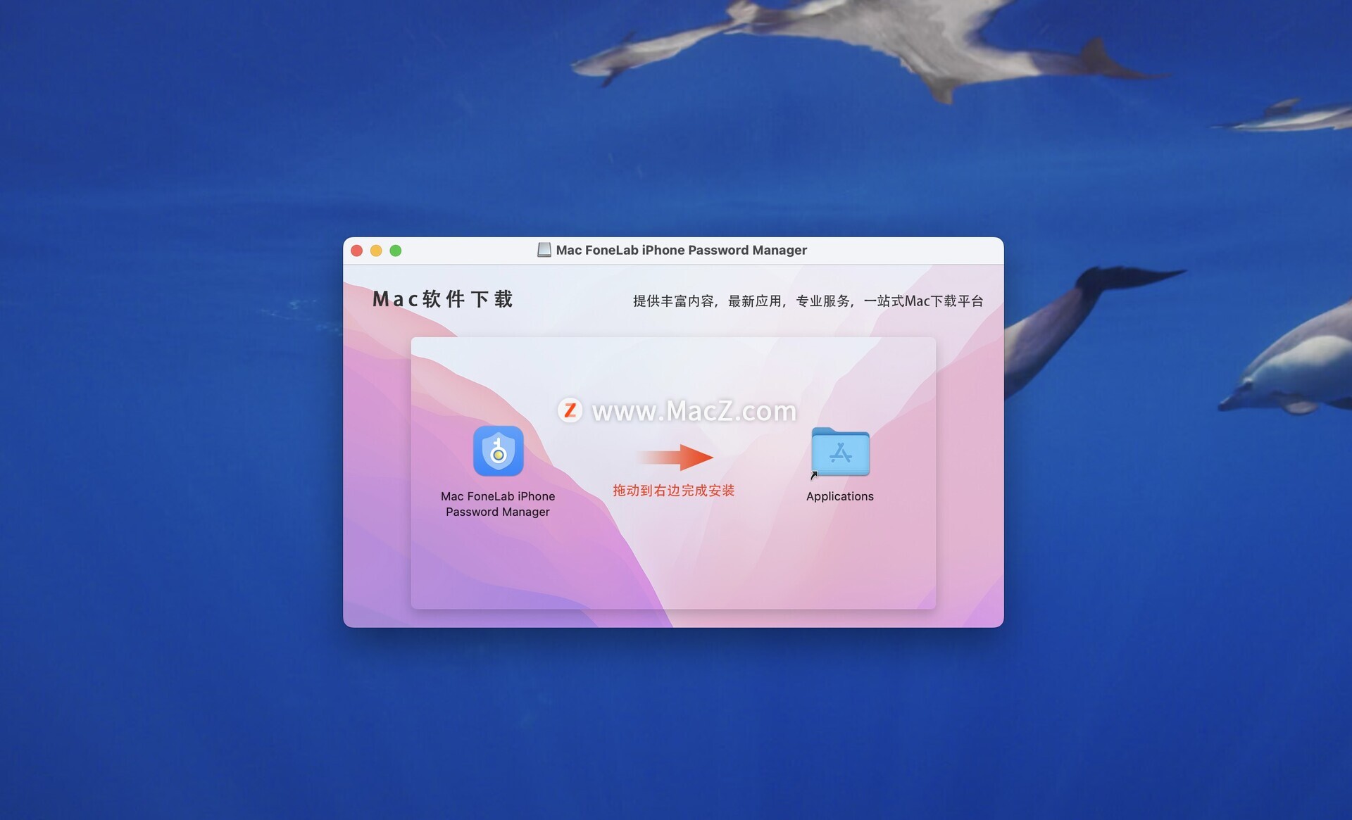 Mac FoneLab iPhone Password Manager下载完成后 打开,拖动左侧的软件到右侧应用程序中即可