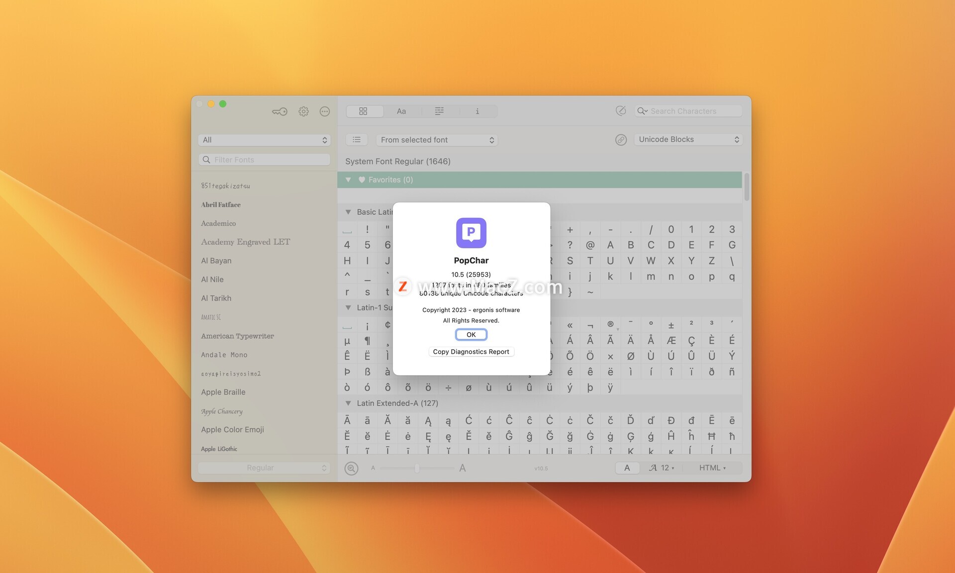 此外,PopChar for Mac还具备智能搜索功能,能够帮助用户快速找到所需的字符。用户可以通过名称搜索字符,识别包含特定字符的字体,或探索一个字体的整个字符集。这使得在大量字体和字符中查找特定字符变得更加高效。