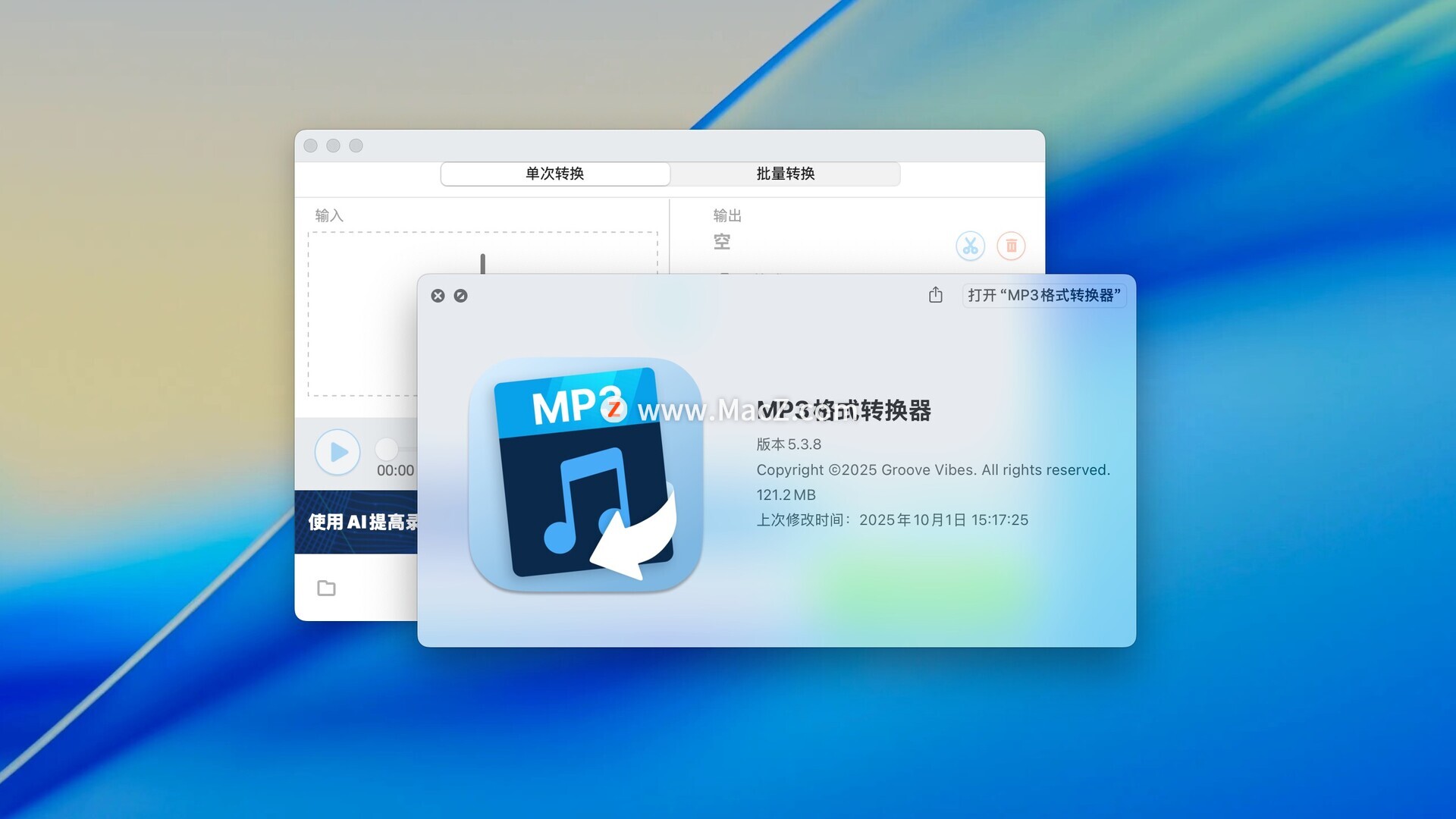 总的来说,All to MP3 Audio Converter for Mac是一款功能强大、操作简便的音频转换软件,适用于各种场景和需求。无论是需要将音频文件转换为MP3格式以便在移动设备上播放,还是需要对音频文件进行剪辑或自定义设置,该软件都能提供满意的解决方案。测试环境:MacOS 15.5