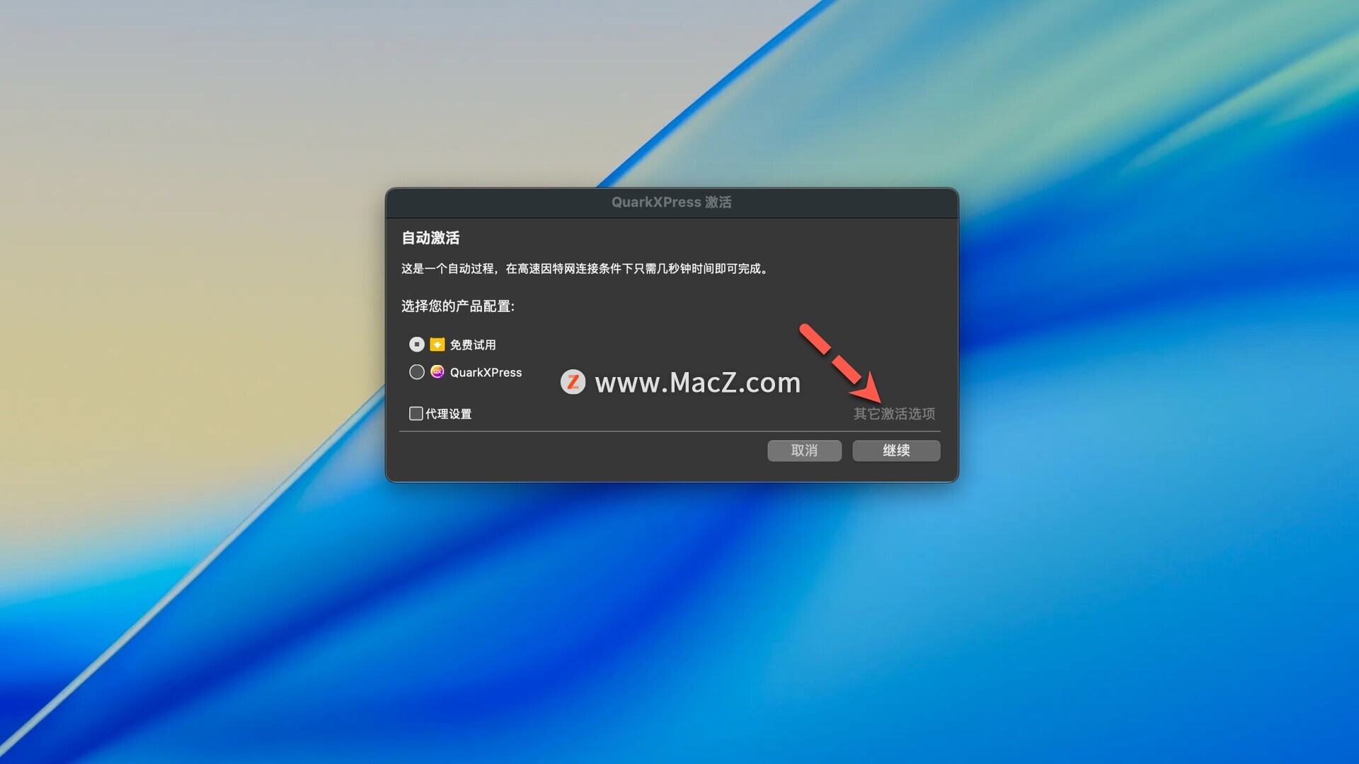 打开QuarkXPress 2024软件,弹出激活页面,点击其他激活选项(备注:断网才有这个选项)