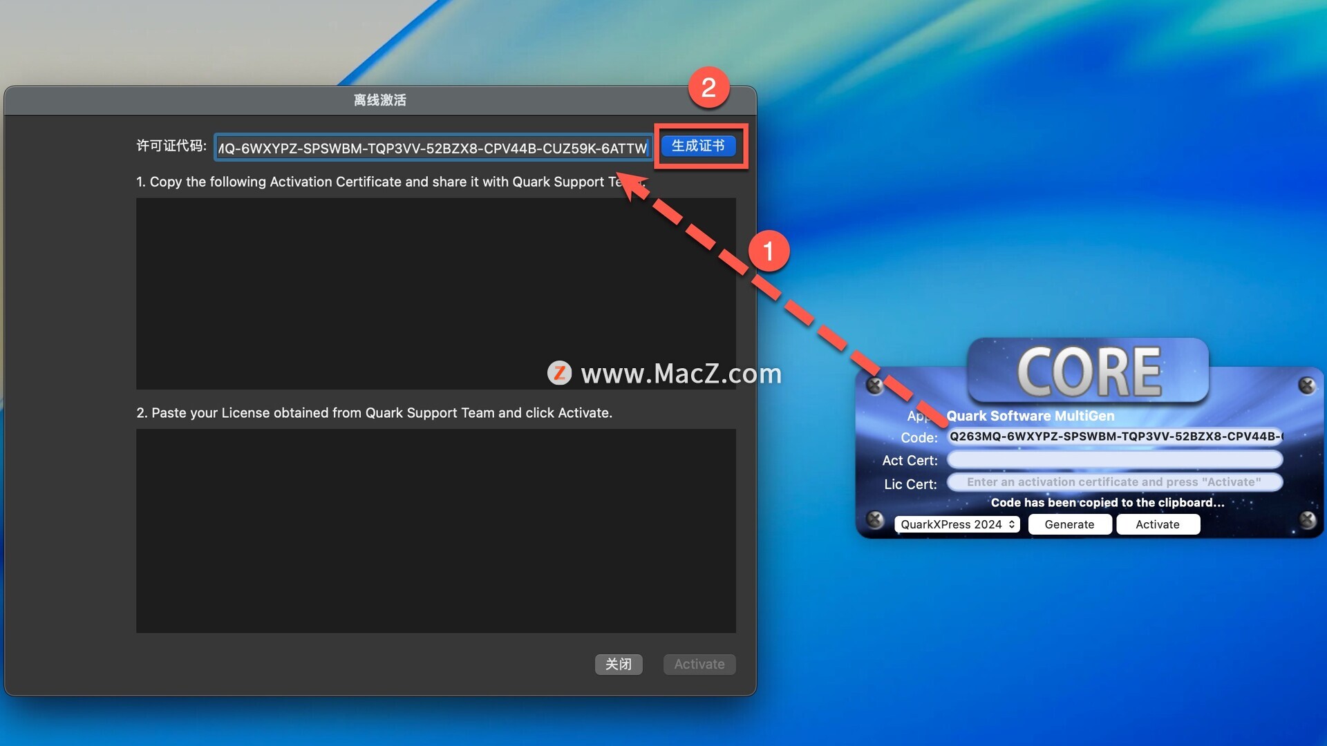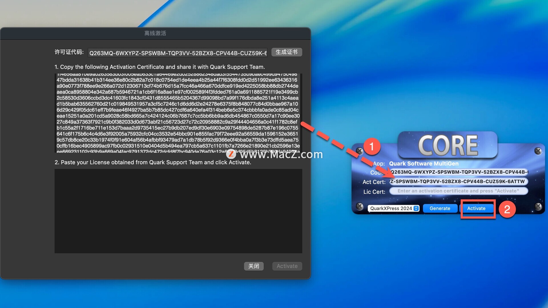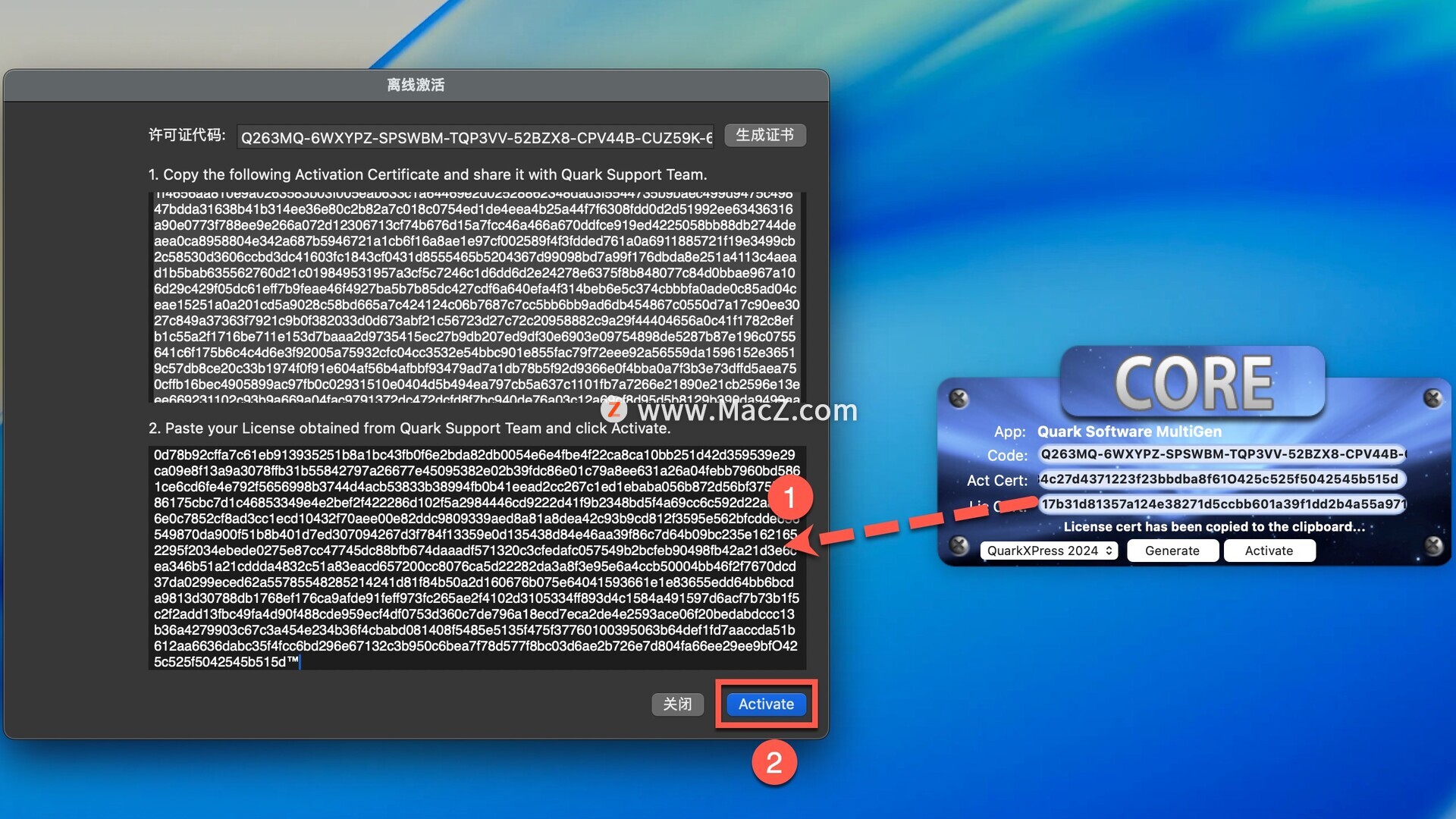 将生成的许可证书复制到Act Cert,点击Activate,如图