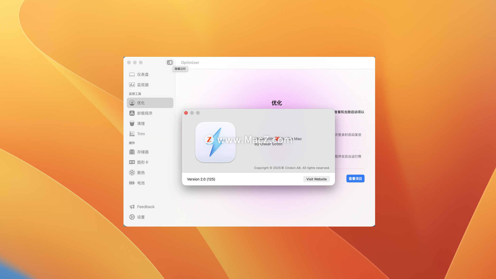 Sensei For Mac是为苹果电脑用户打造的一款实用的系统优化清理工具,使用这款工具可以有效地查看苹果电脑的各种性能指标,包括电池的状态、CPU和内存的使用等,同时还支持一键对性能进行优化,有效地提升MAC的性能。测试环境:MacOS 13.6.1