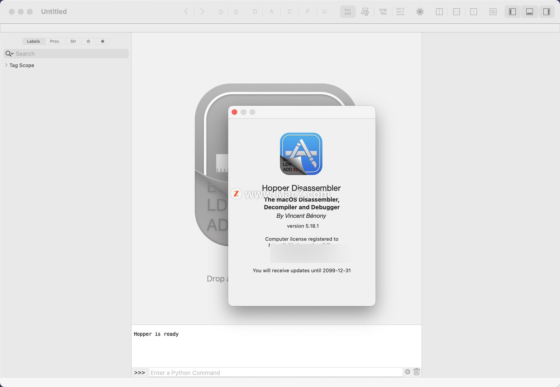 可编写脚本 大多数 Hopper 功能都可以从 Python 脚本调用,使您能够以任何您想要的方式转换二进制文件。 调试器 Hopper可以使用LLDB或GDB,它可以让您以动态方式调试和分析二进制文件(仅适用于Mac和Linux主机,不适用于移动设备)。 Objective-C 即使 Hopper 可以反汇编任何类型的 Intel 可执行文件,它也不会忘记其主要平台。 Hopper 专门用于检索您分析的文件中的 Objective-C 信息,例如选择器、字符串和发送的消息。 反编译器 基于对可执行文件的深入理解,Hopper 可以呈现可执行文件中的过程的伪代码表示。 直接从交互式 CFG 视图中编辑、注释、评论您的作品。