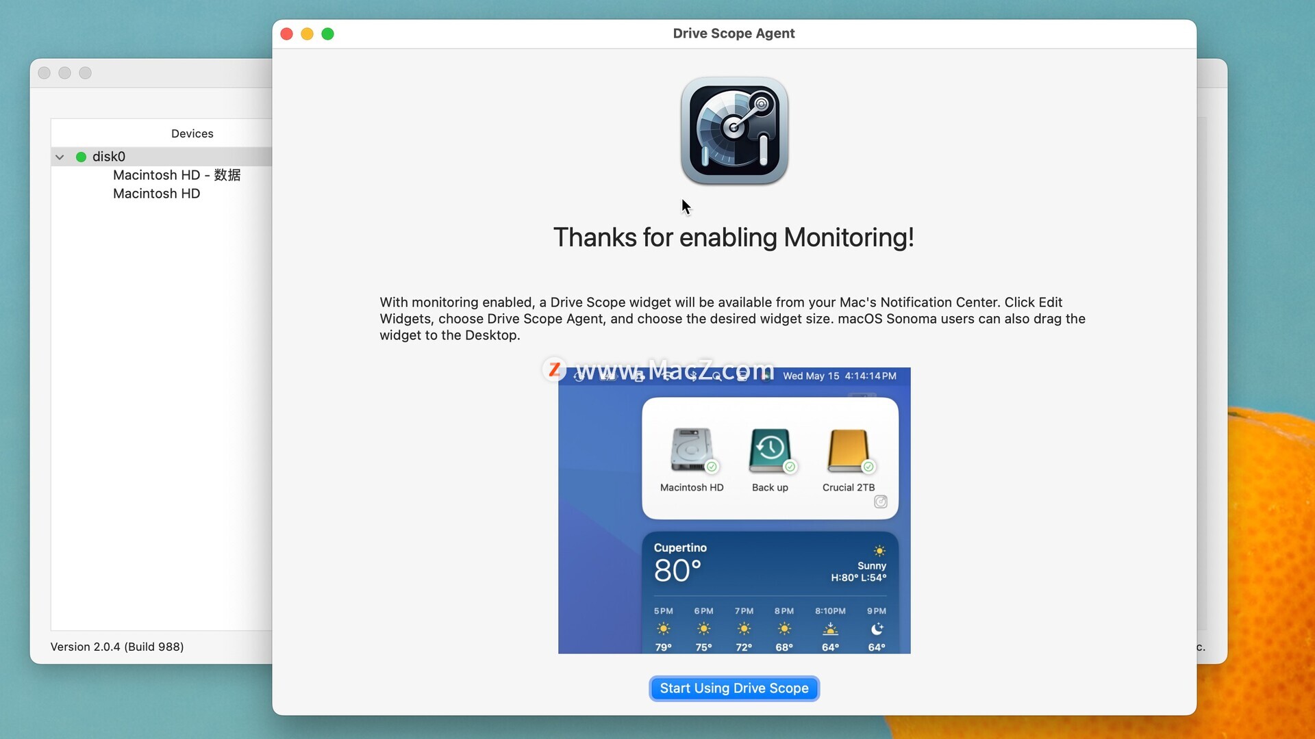 更简单的是,添加 Drive Scope 小部件,让驱动器的健康状况始终处于中心位置。Sonoma 用户可以将此小部件添加到 Mac 桌面,以便持续关注驱动器的健康状况。