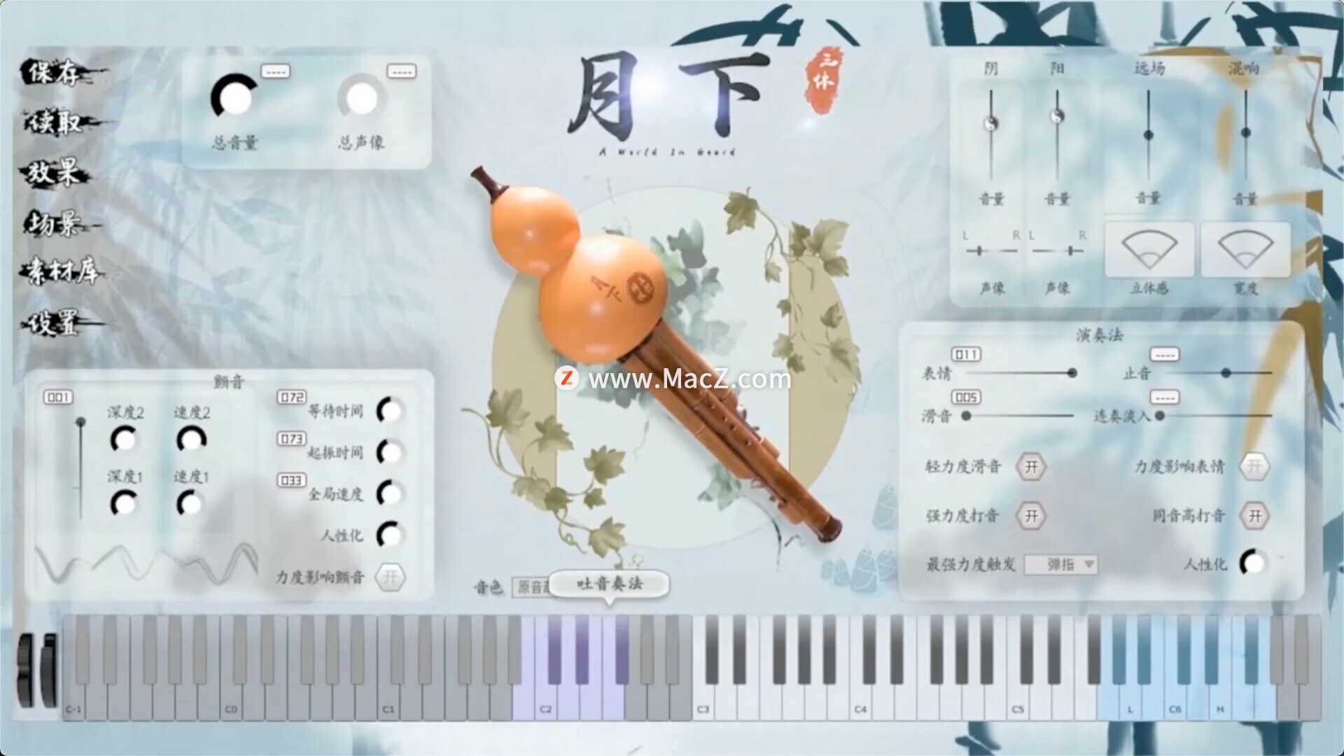 - 通过控制气流和手指,葫芦丝具有摩登、指杆弹出、颤音、颤音、颤音、断奏、滑音等非常丰富的演奏效果。所有这些演奏都可以在Gourd软件中的World中触发,使其成为最可调的葫芦丝虚拟乐器。