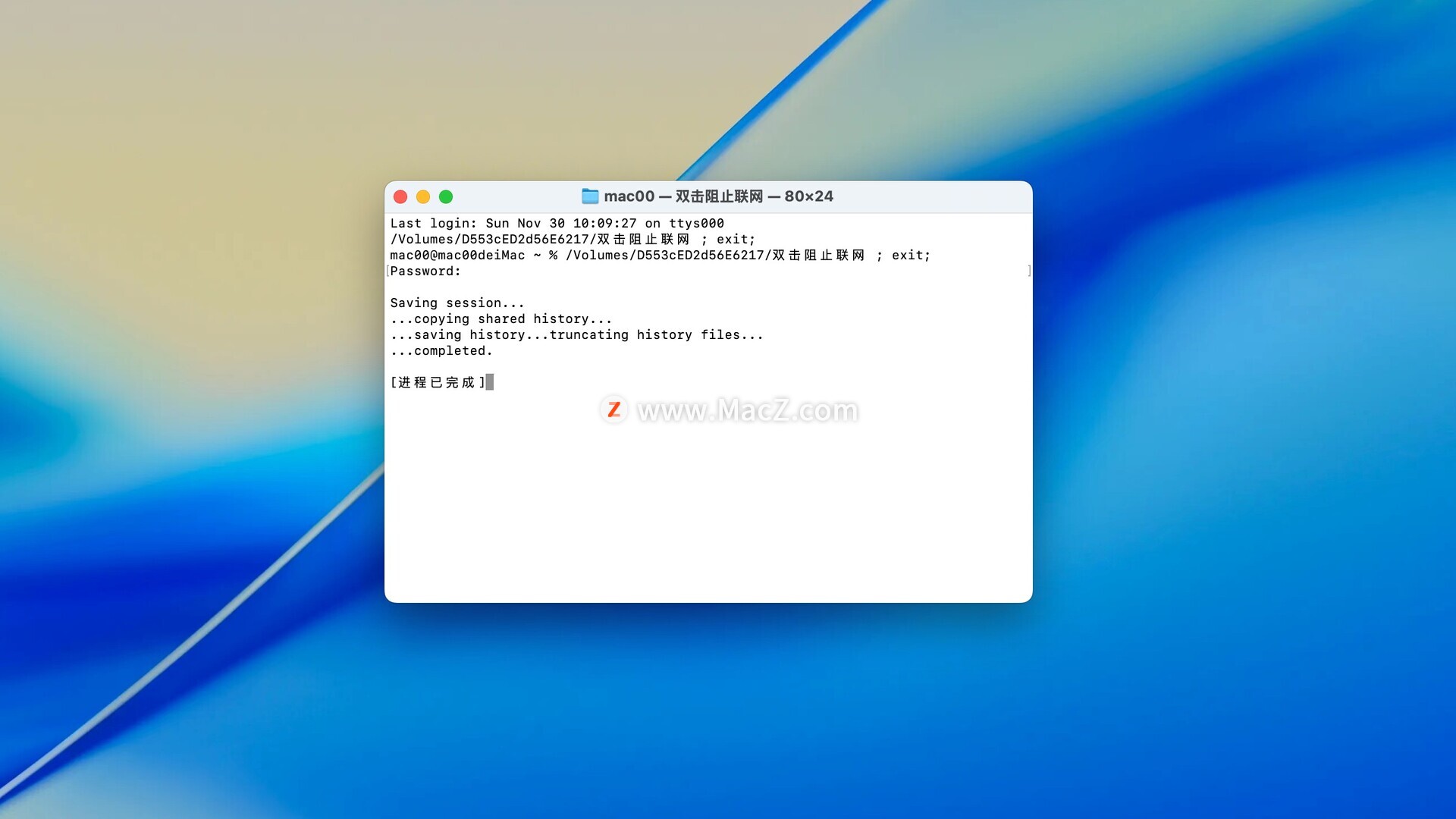 弹出终端窗口,输入电脑密码,回车,完成即可