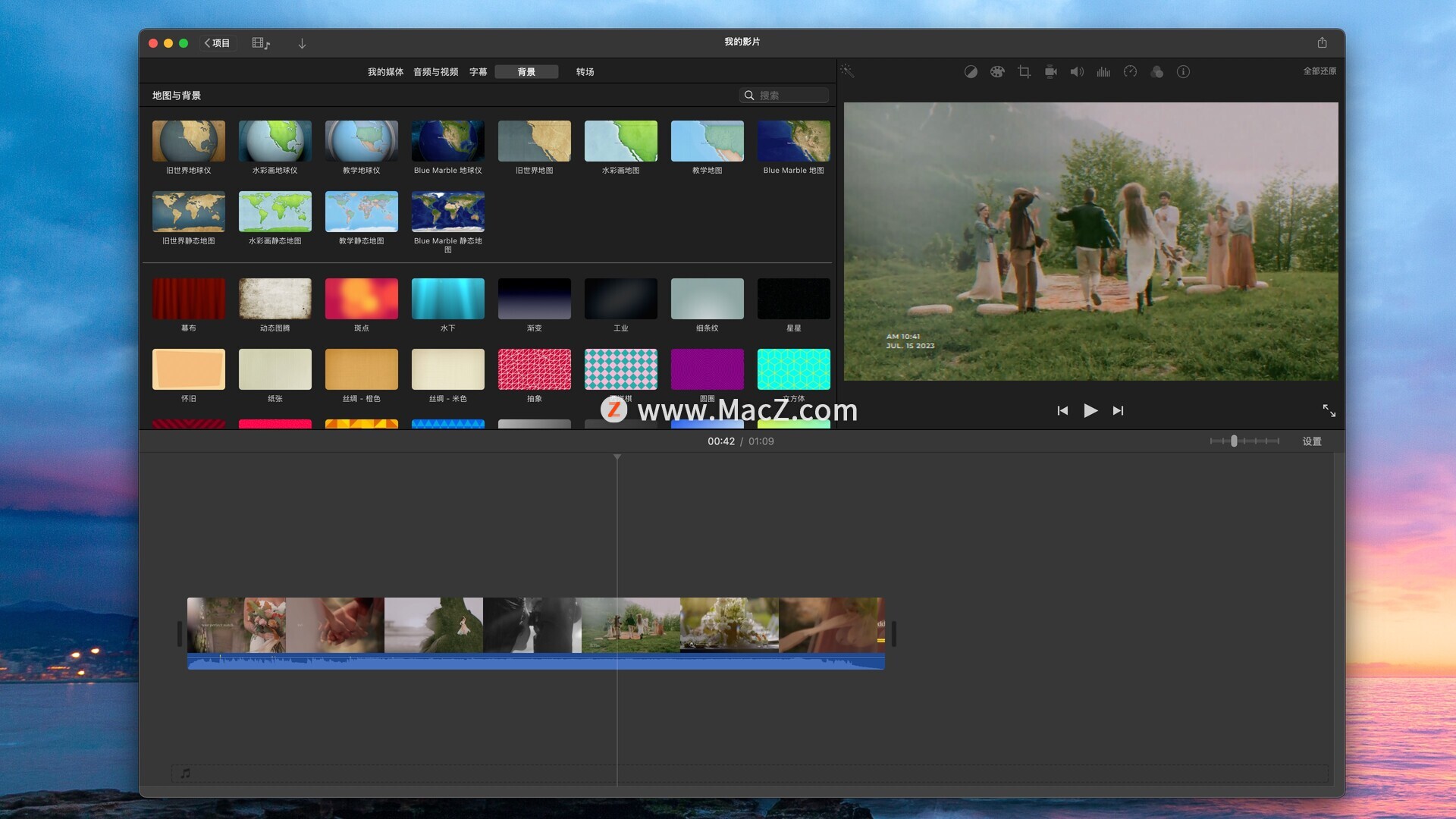 你可以改变动作片的速度,营造更加惊险刺激的效果*。或者运用画中画和分割画面效果,让你的课堂报告看起来好像专业新闻播报。又或者利用 macOS 版 iMovie 剪辑的绿屏效果,让主角置身异国场景。