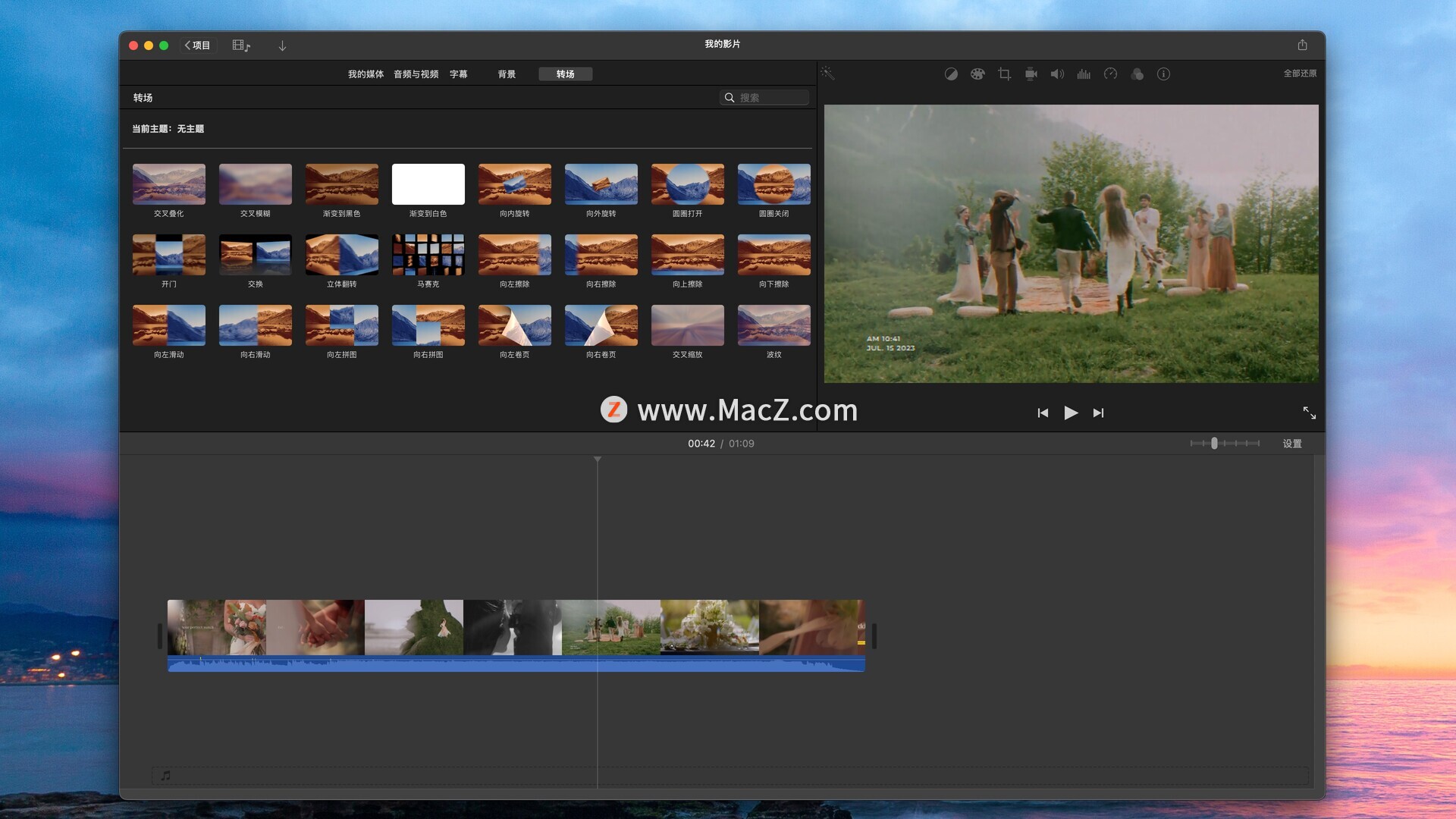 从 10 种创意视频滤镜中进行选择,为你的影片添加几分大片感觉。你可以选择怀旧单色风、老式西部风,又或是蓝色未来主义风。你既可为单独的视频片段添加滤镜,也可一次性为整条片添加效果。