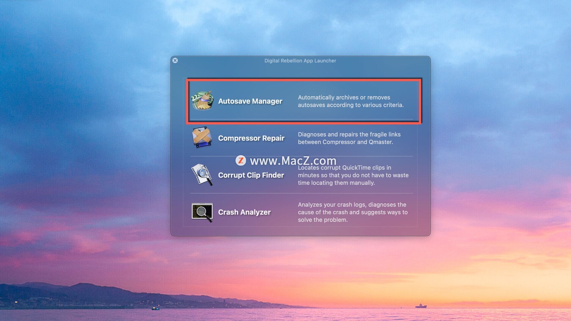 Pro MAIntenance Tools 可让您的编辑系统平稳运行,因此您可以在出现问题时快速恢复正常。使用诊断工具通过分析崩溃日志或查找损坏的媒体文件来确定问题的原因,然后使用修复工具修复问题。Pro MAIntenance Tools 支持 Final Cut Studio、Final Cut Pro X、Avid Media Composer/Avid Symphony 和 Adobe Premiere Pro for Mac。
