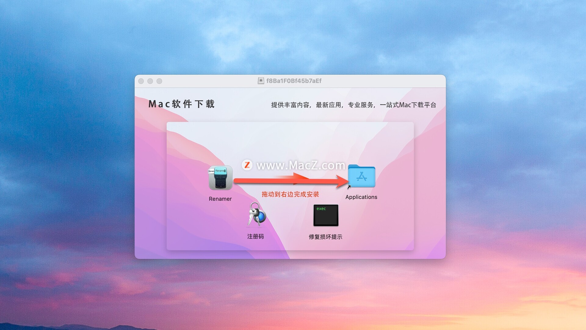 Renamer 7 mac破解版下载完成后打开,拖动左侧的软件到右侧应用程序中
