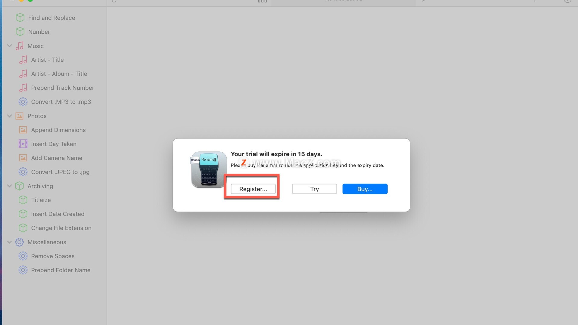 应用程序中打开Renamer软件,弹出注册页面,点击register