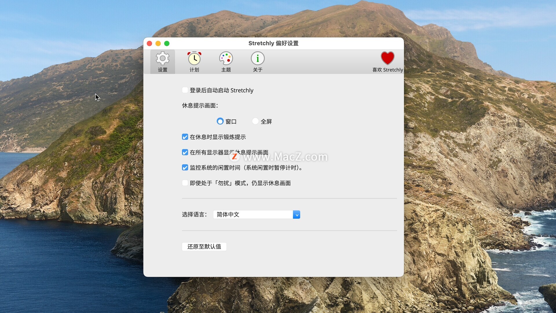 stretchly for Mac(休息提醒软件)stretchly是一款定时休息提醒软件,主要的功能也十分简单,就是每十分钟提醒你休息20秒,适合每天坐在办公室的上班族,没有复杂的选项,操作也非常简单。