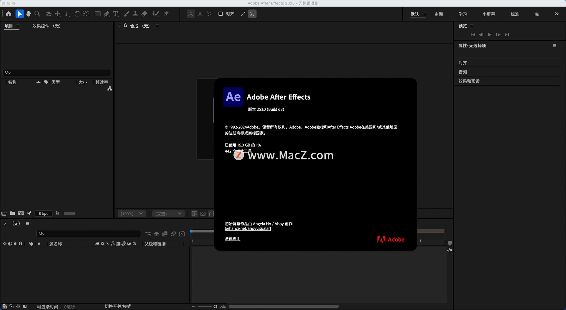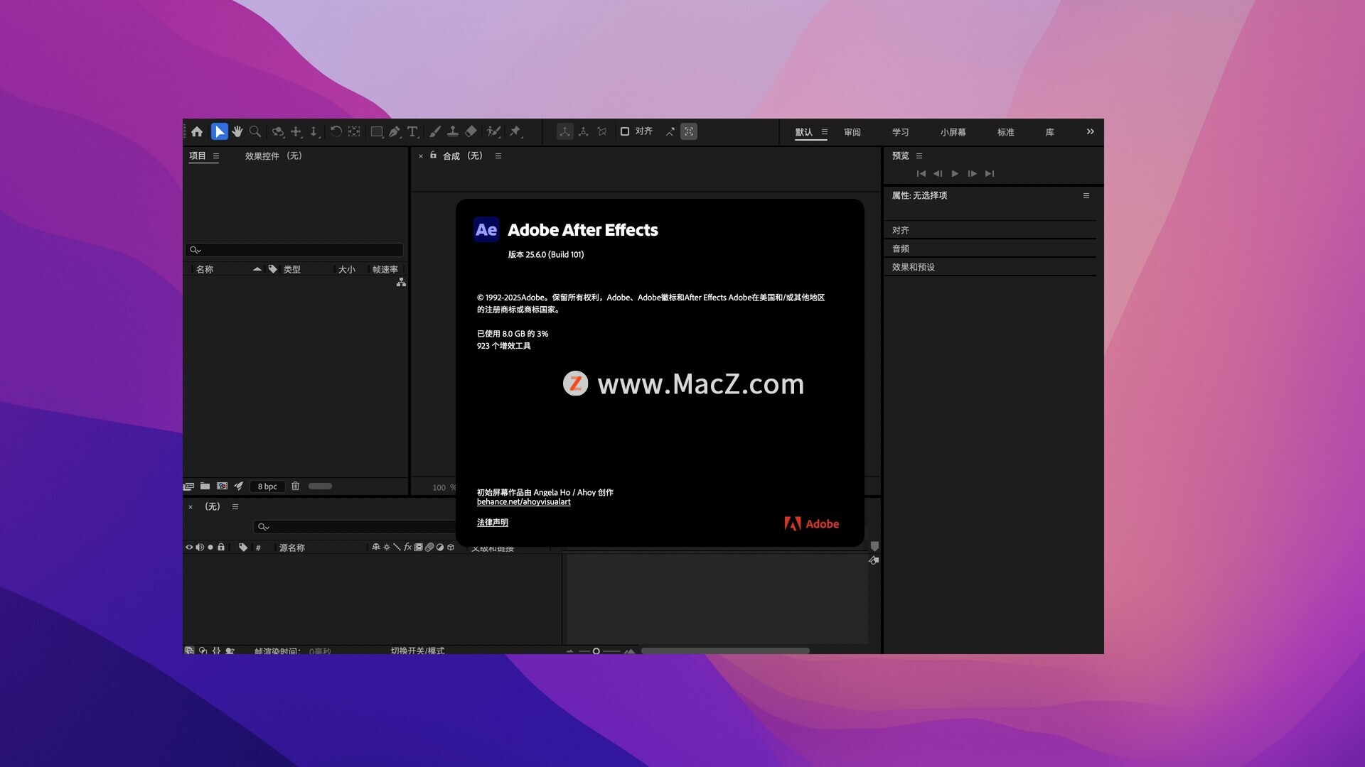 After Effects 简称 AE,是来自 Adobe 的专业视频后处理优化软件。After Effects 2025 for mac采用先进的渲染技术,可以处理三维深度效果、显示色彩管理、添加虚拟现实效果和动态图形处理。在高端视频效果方面,它与动画和 xd 更紧密地结合在一起,帮助用户高效、准确地创建大量引人注目的动态图形和令人惊叹的视觉效果。该软件可以帮助用户轻松创建、处理和创建各种视频效果。测试环境:MacOS 15.0