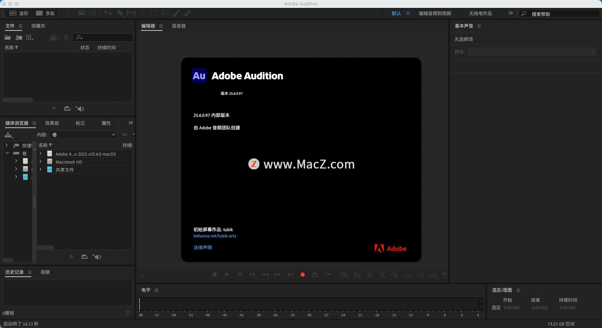 Adobe Audition 2025 for Mac 是一款专业的音频编辑软件。它支持多轨道编辑,可同时处理多个音频素材,还具备强大的音频修复功能,能去除噪音等干扰。软件提供丰富的音频效果和处理工具,如均衡器、压缩器等。此外,它可与 Adobe Premiere Pro 等软件无缝集成,方便音频与视频的协同制作。