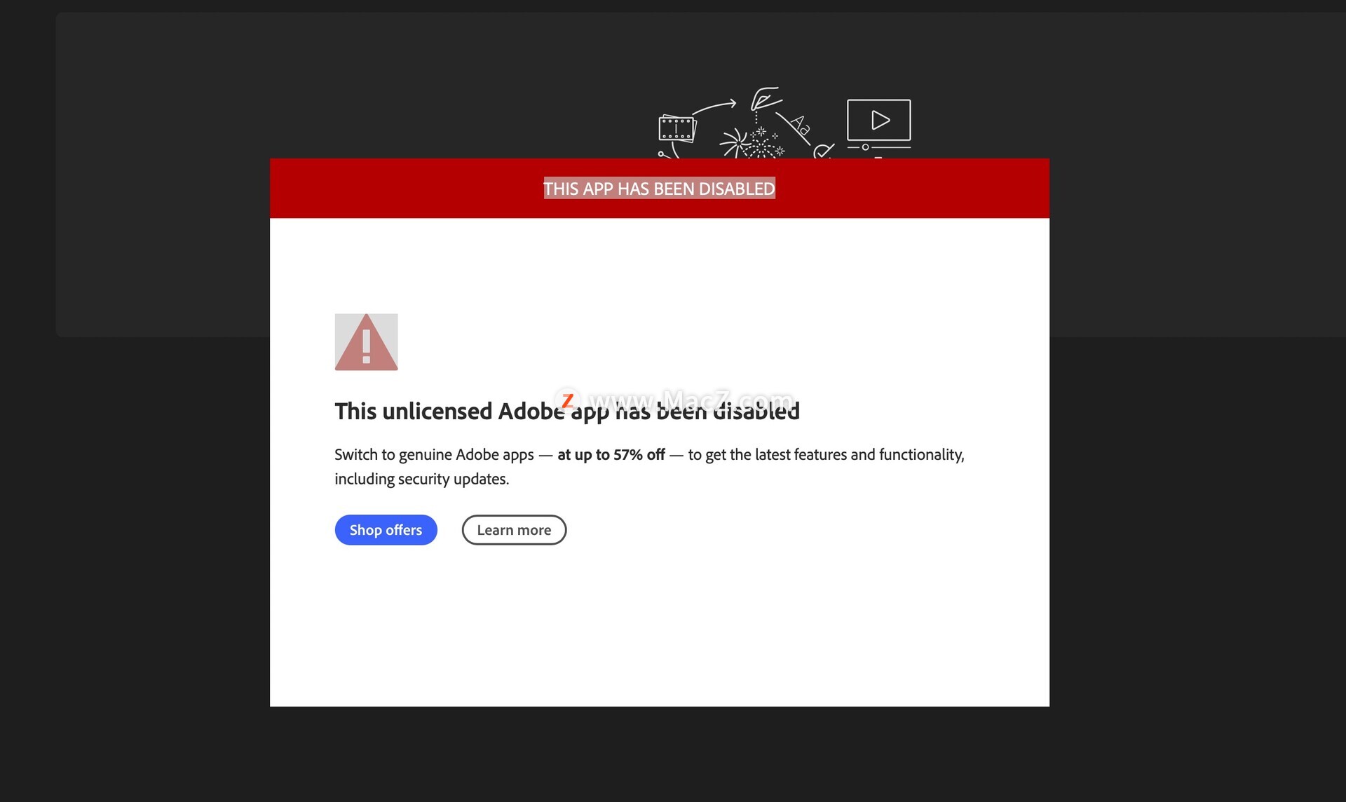 注意事项:如试用pr过程中提示This non-genuine Adobe app has been disabled弹窗,如图