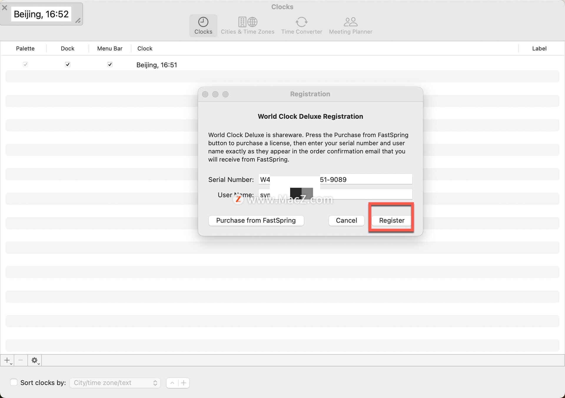 把world clock deluxe注册码和名字输入到软件中,然后点击register即可如图
