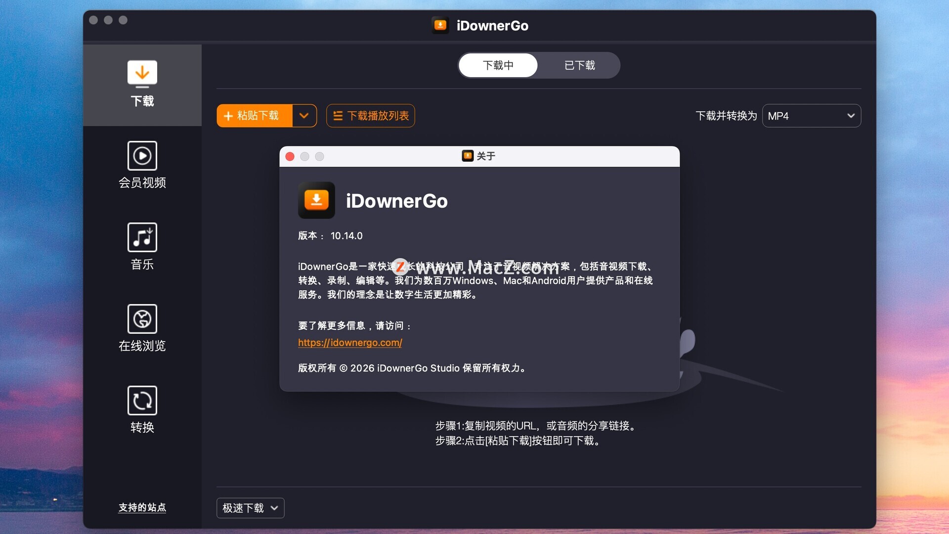 iDownerGo 带有内置网络浏览器,可让您轻松浏览视频/音频共享网站并直接在网站内下载视频。
