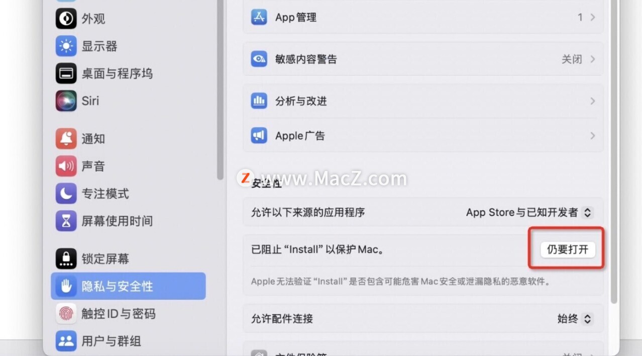 并在系统设置隐私与安全性里面点击仍要打开,才能安装