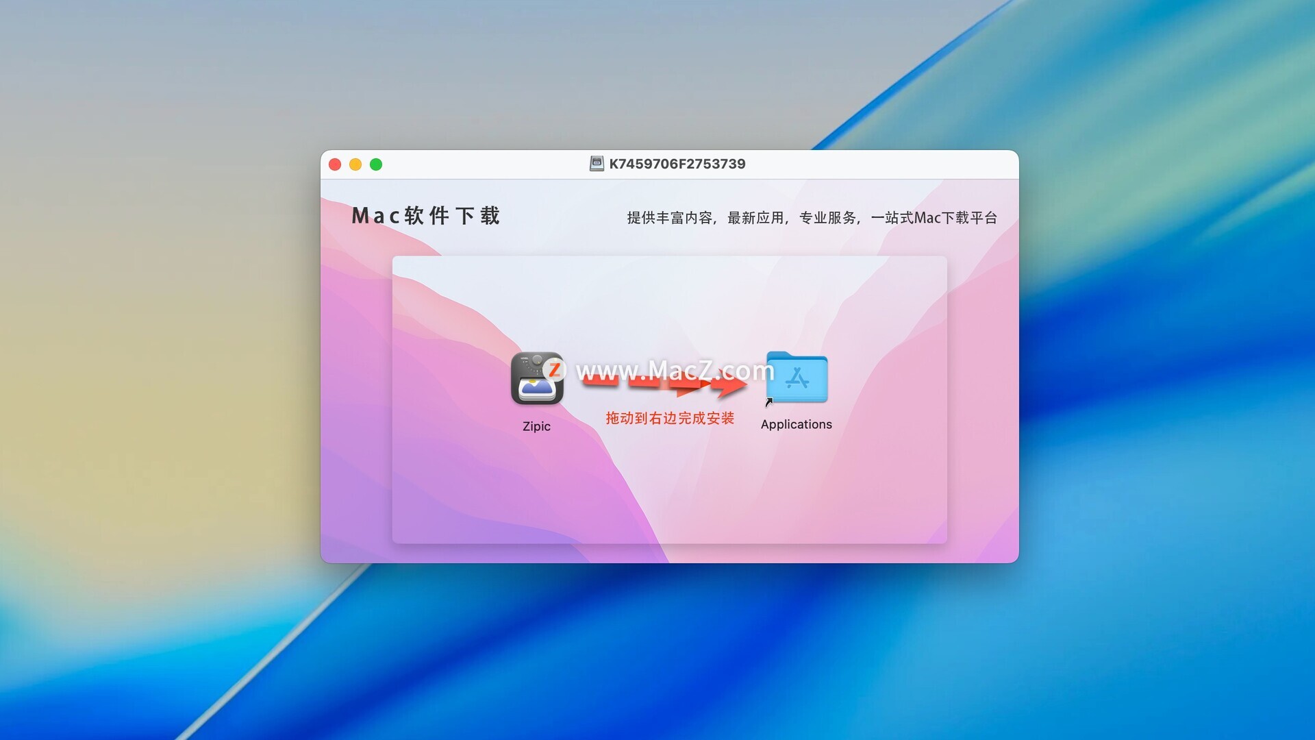 Zipic破解版下载完成后打开,拖动左侧的软件到右侧应用程序中即可