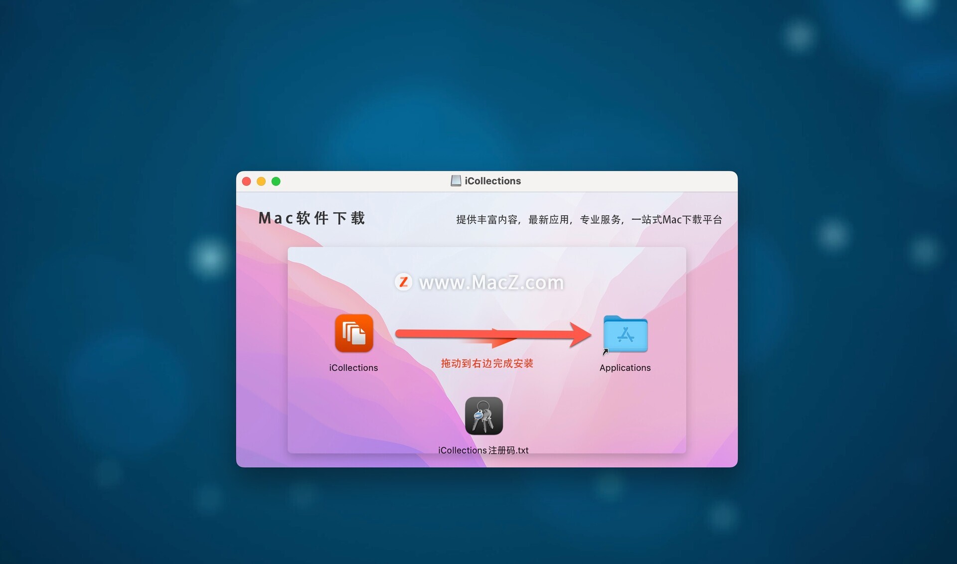 安装包下载完成后,拖动左侧的iCollections到右侧应用程序中