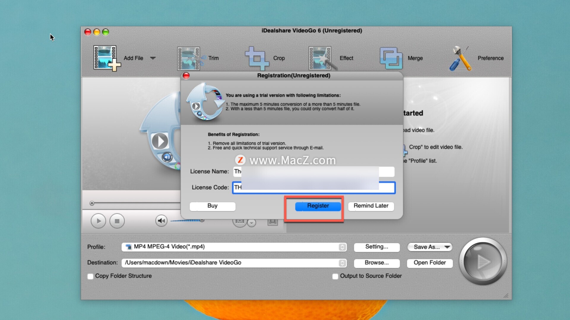 回到注册页面,输入注册码后点击“Register”,如下图: