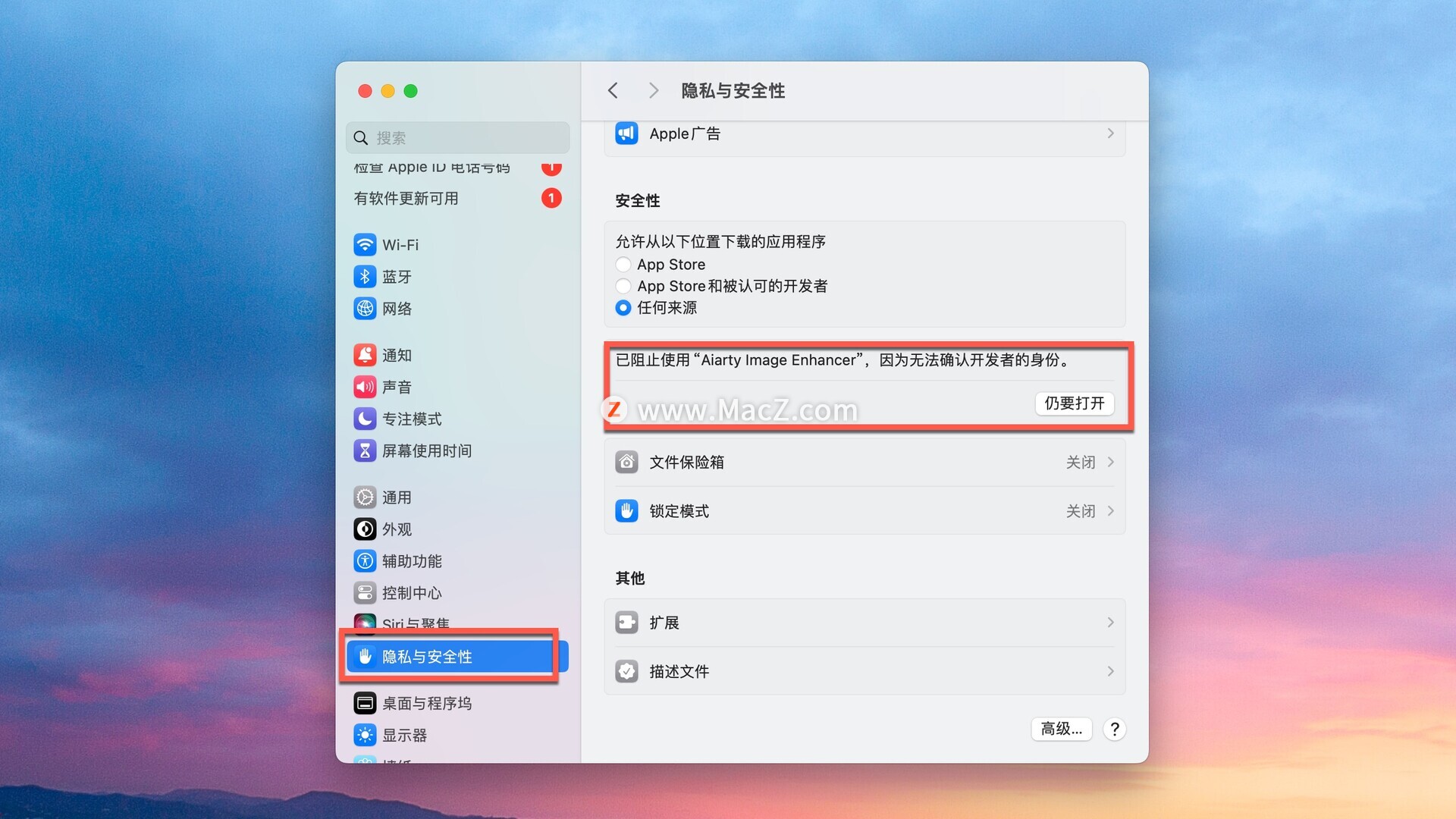 在系统设置-隐私与安全中点击仍要打开即可
