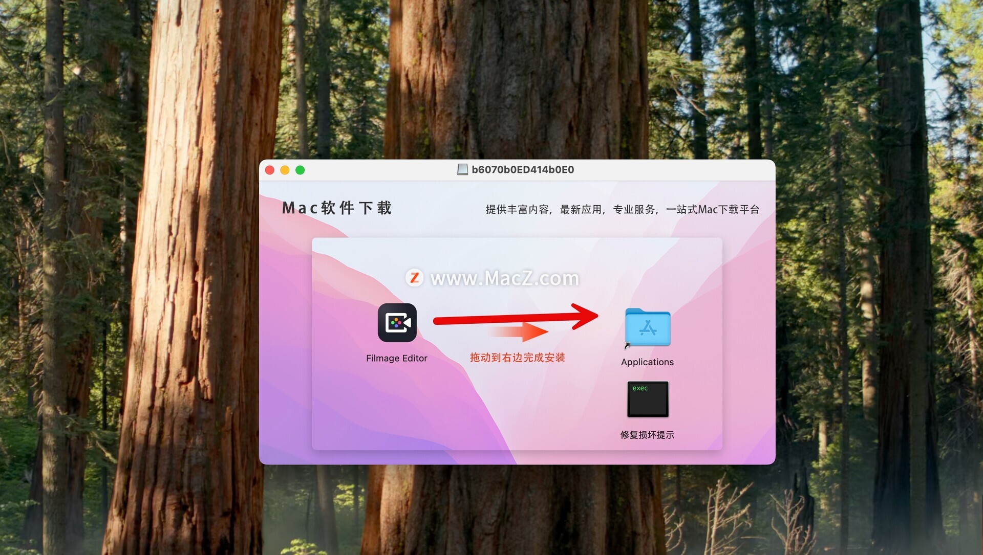 安装包下载完成后,拖动左侧的Filmage Editor到右侧应用程序中