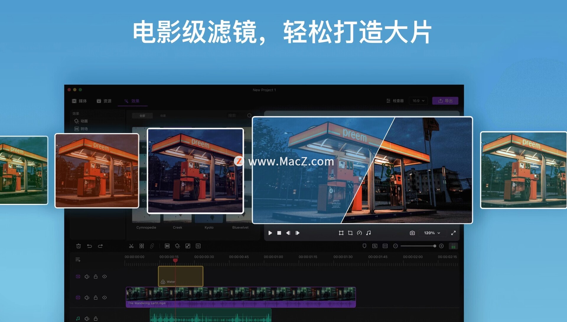 - 使用 60 多种滤镜,打造精美的 4K 电影。添加大片效果,让您的视频更具电影感。