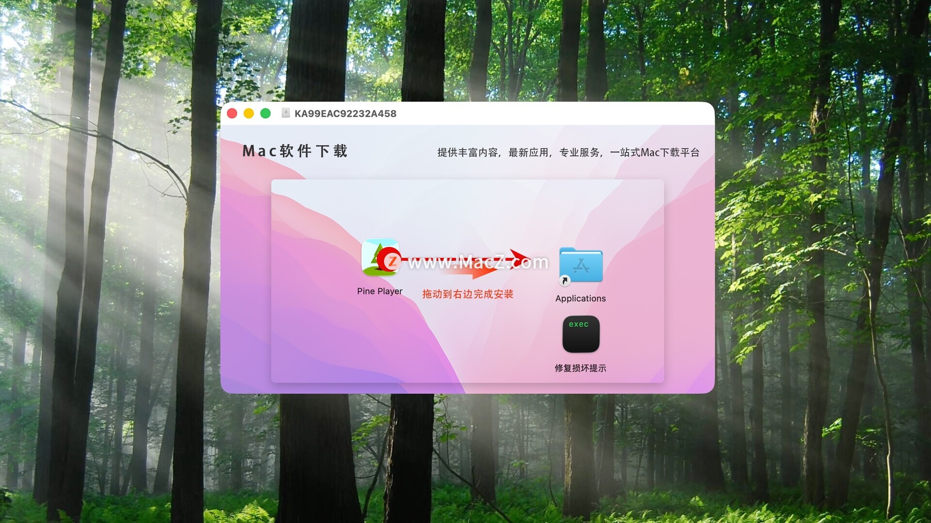 将左侧的Pine Player拖动到右侧的应用程序中即可,如图