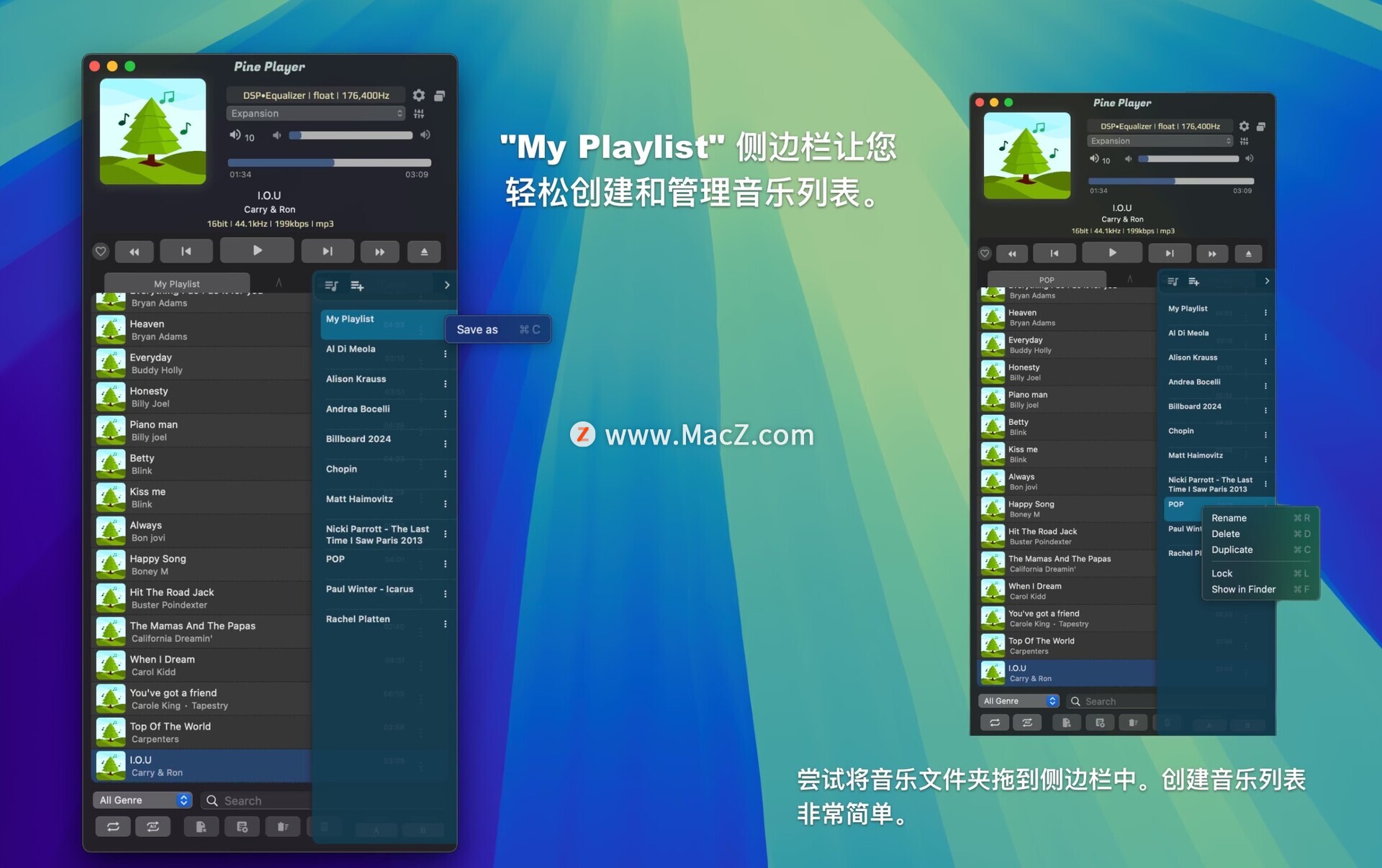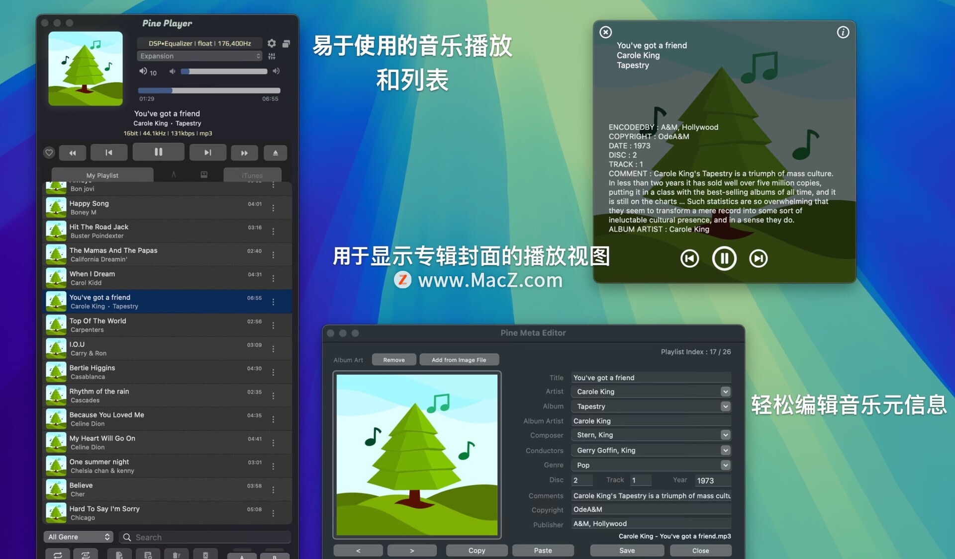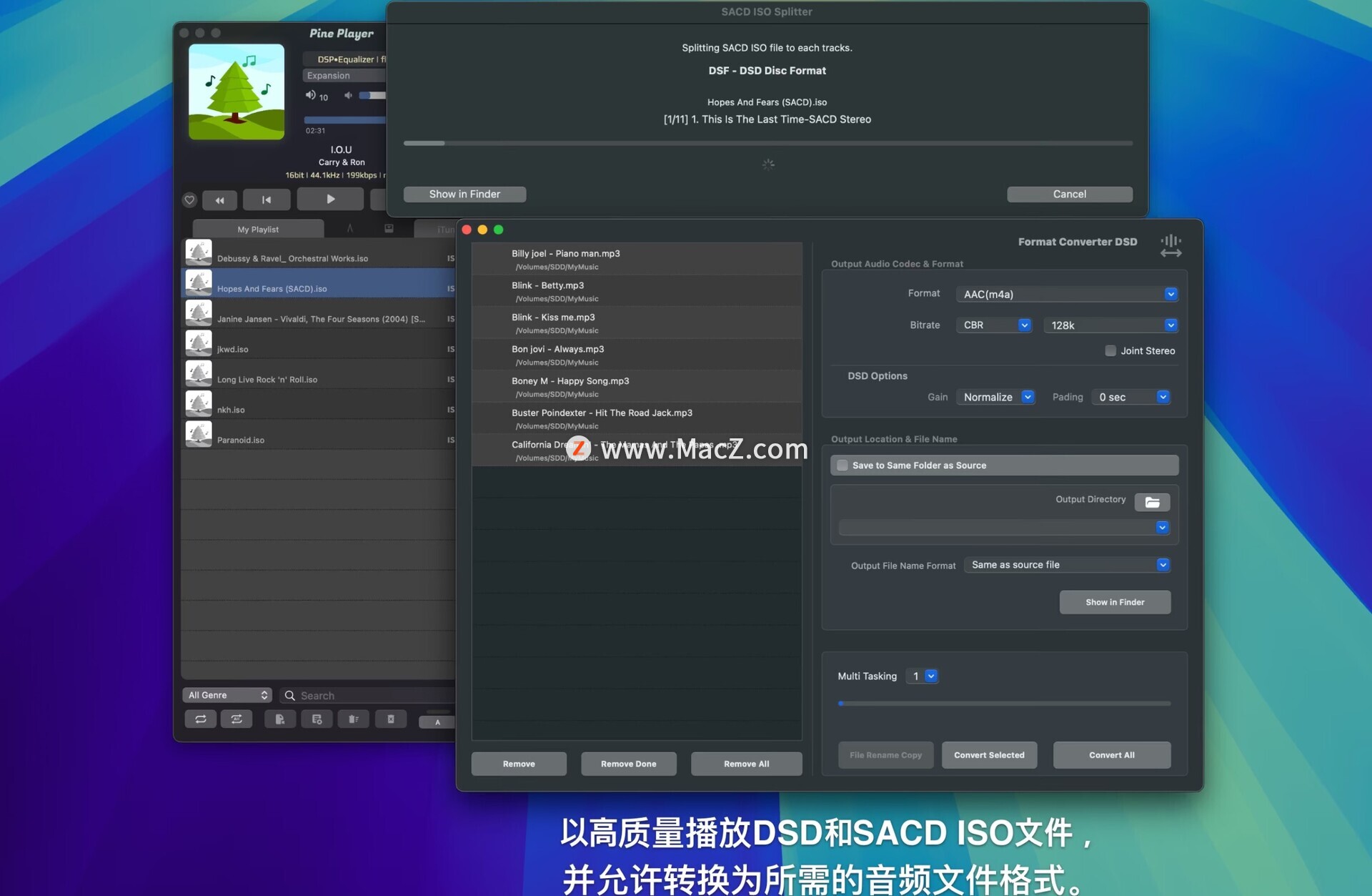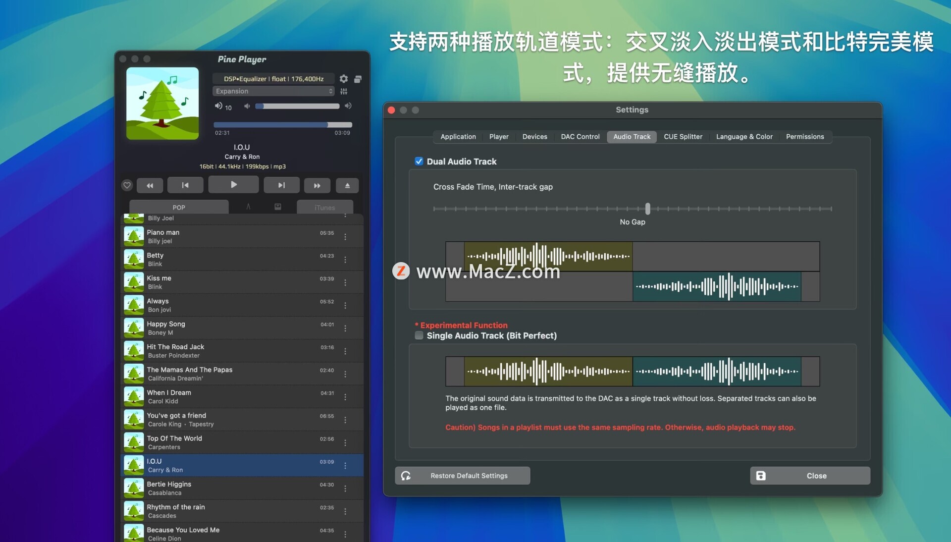 Pine Player 是一款专为使用 OSX 操作系统的音乐爱好者打造的聆听数字音乐播放器。它可以播放几乎所有现有的数字音频格式,例如 MP3、FLAC、APE、AAC、M4A、WAV、AIFF、OGG、WMA、DSD、SACD ISO、OPUS 等,并且还具有强大的播放能力,可以以最便捷的方式收听 CUE 文件。