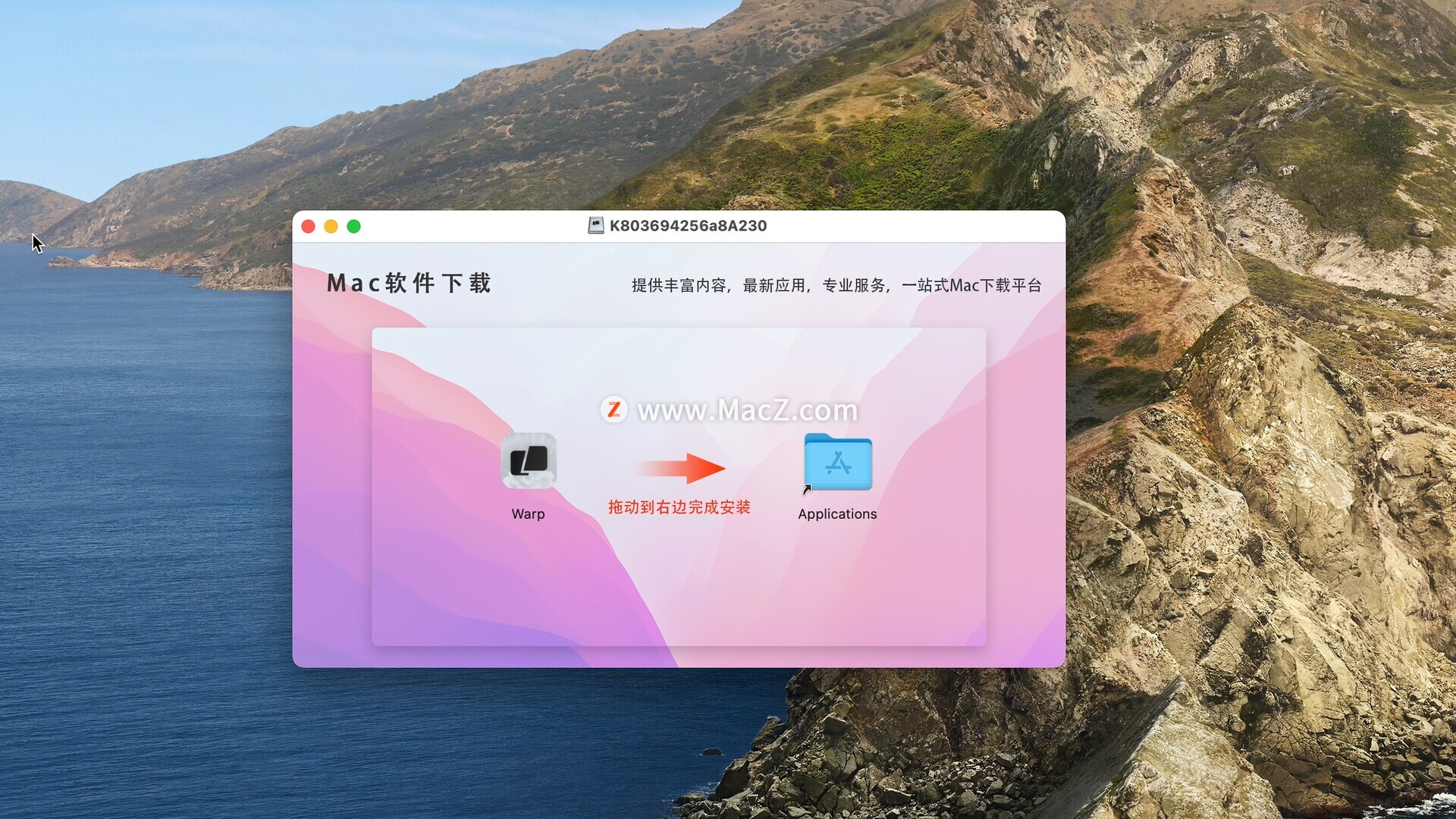 Warp终端下载完成后打开,拖动左侧的软件到右侧应用程序中即可