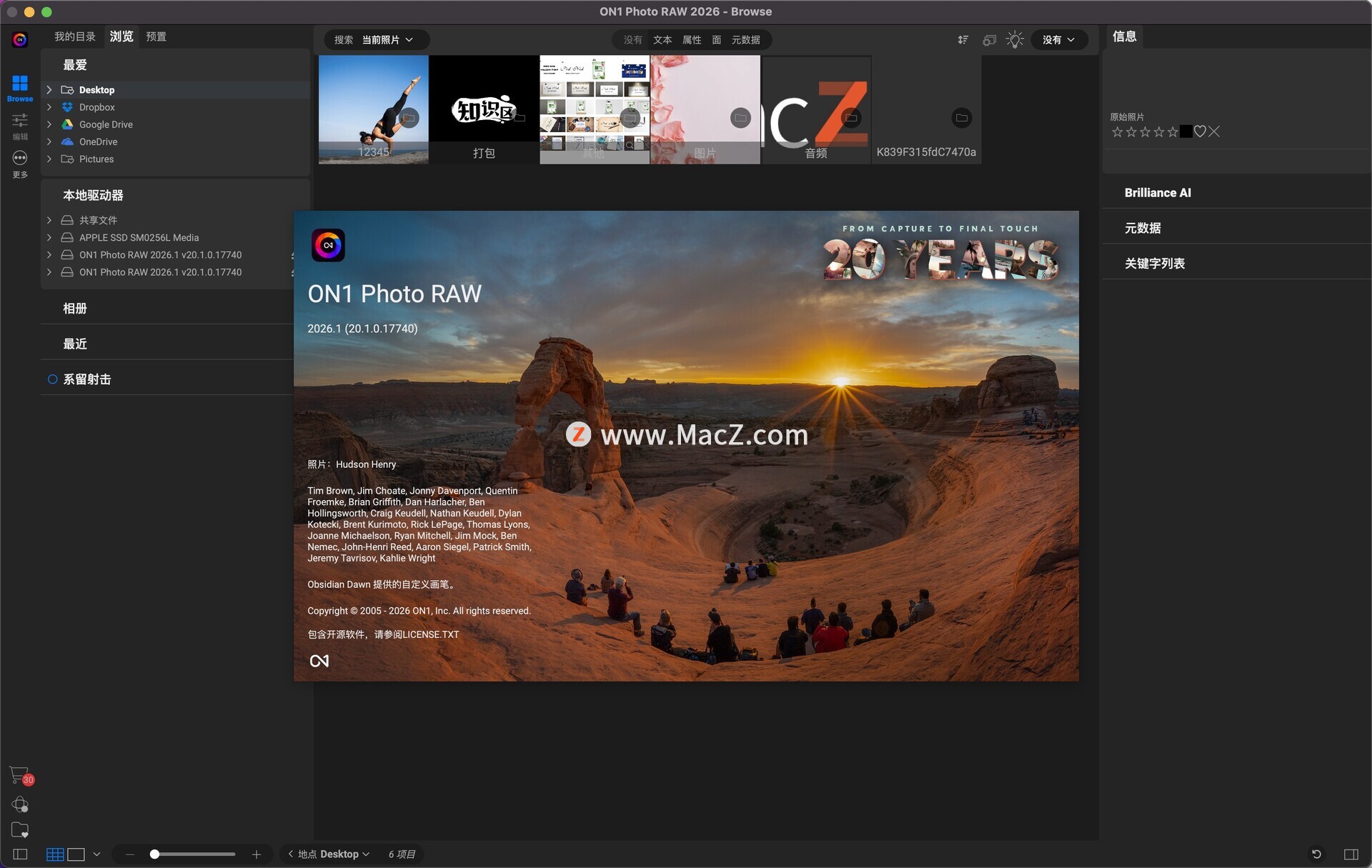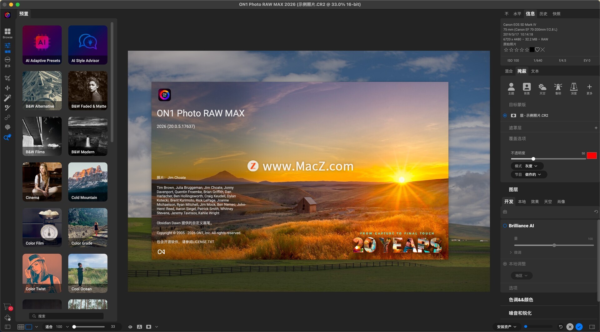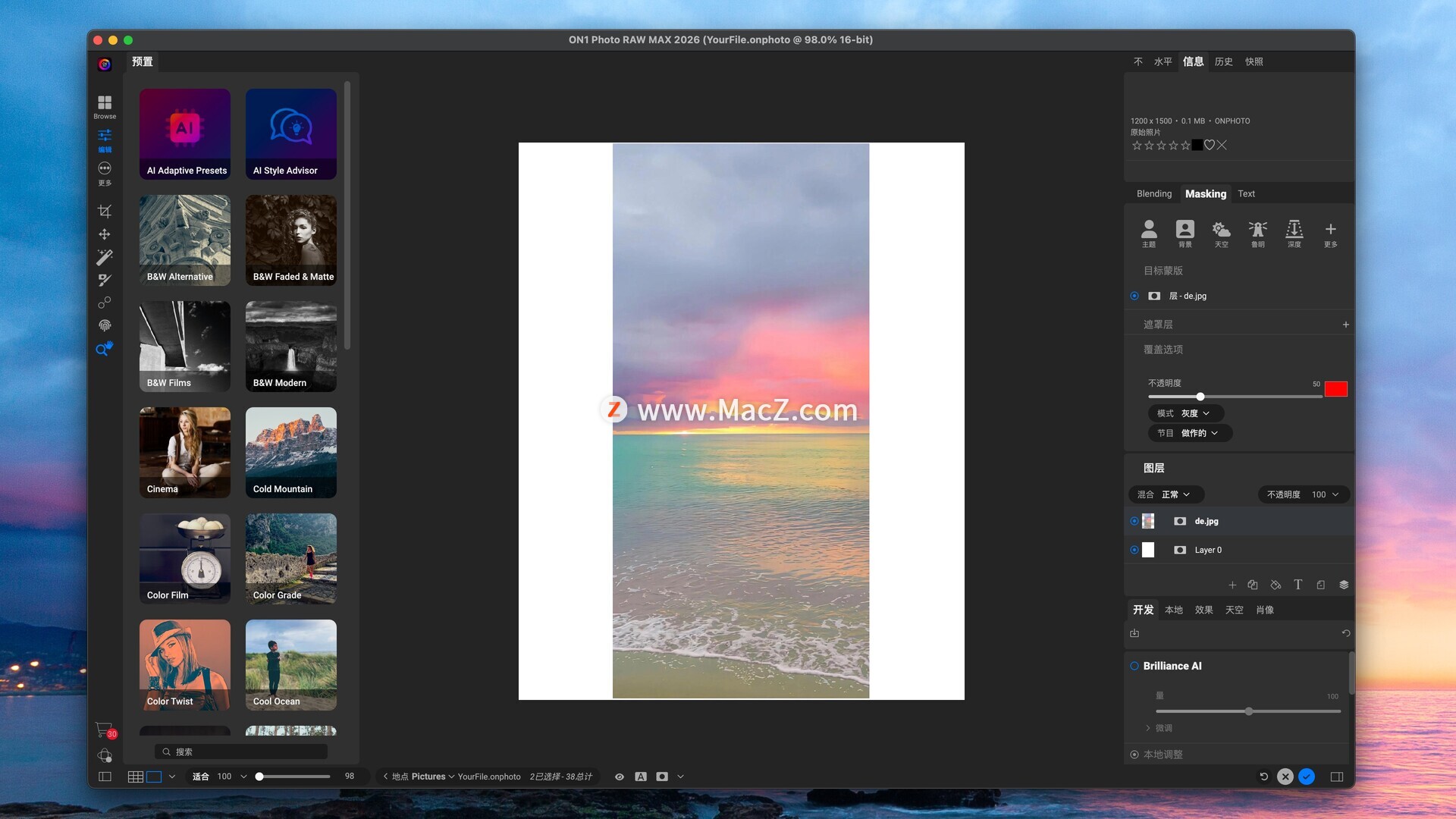 ON1 Photo RAW 2026 是一款功能强大的照片编辑软件,为摄影师提供众多工具和功能,帮助他们增强和修饰图像。它拥有用户友好的界面,提供高级编辑功能,包括无损编辑、AI 调整以及对色彩和色调的精确控制。它还支持 800 多种相机的 RAW 文件,并兼容 JPEG、TIF、psD、psB、PNG 和 DNG 文件。