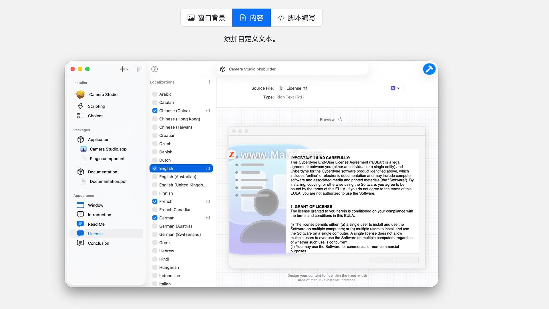 - 通过添加许可协议(支持多种语言),您可以要求用户在继续安装之前同意该协议。