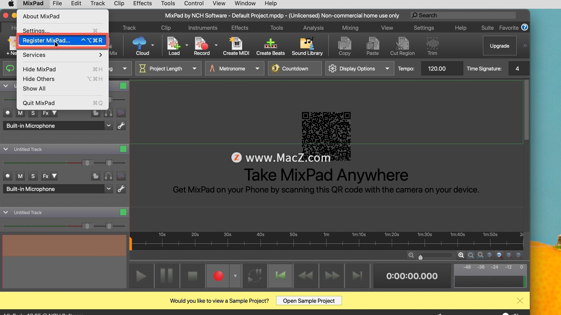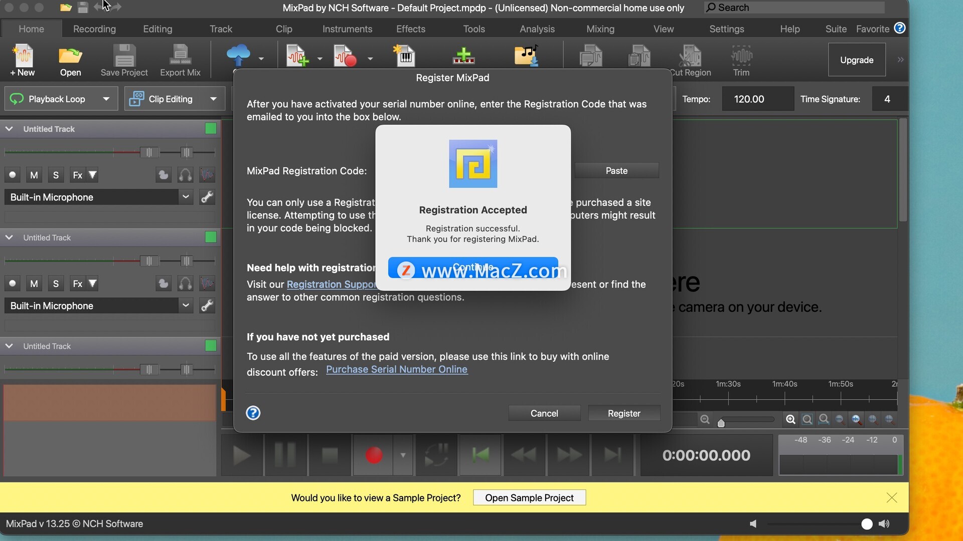 在应用程序中找到然后打开,点击左上角MixPad-Registar进行激活,如图