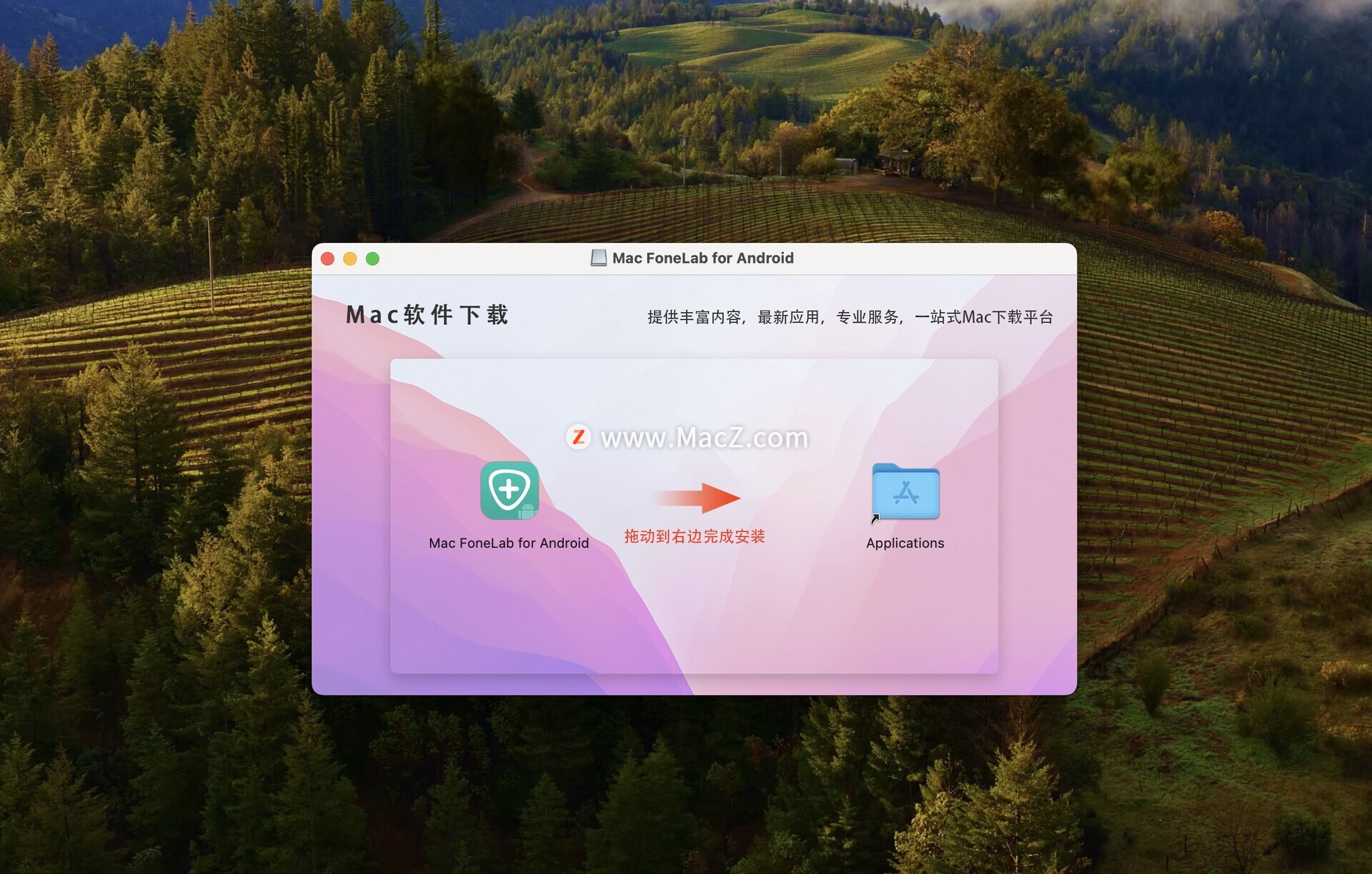 将左侧【Mac FoneLab for Android】拖入右侧【Applicatios】应用程序中进行安装,即可使用。