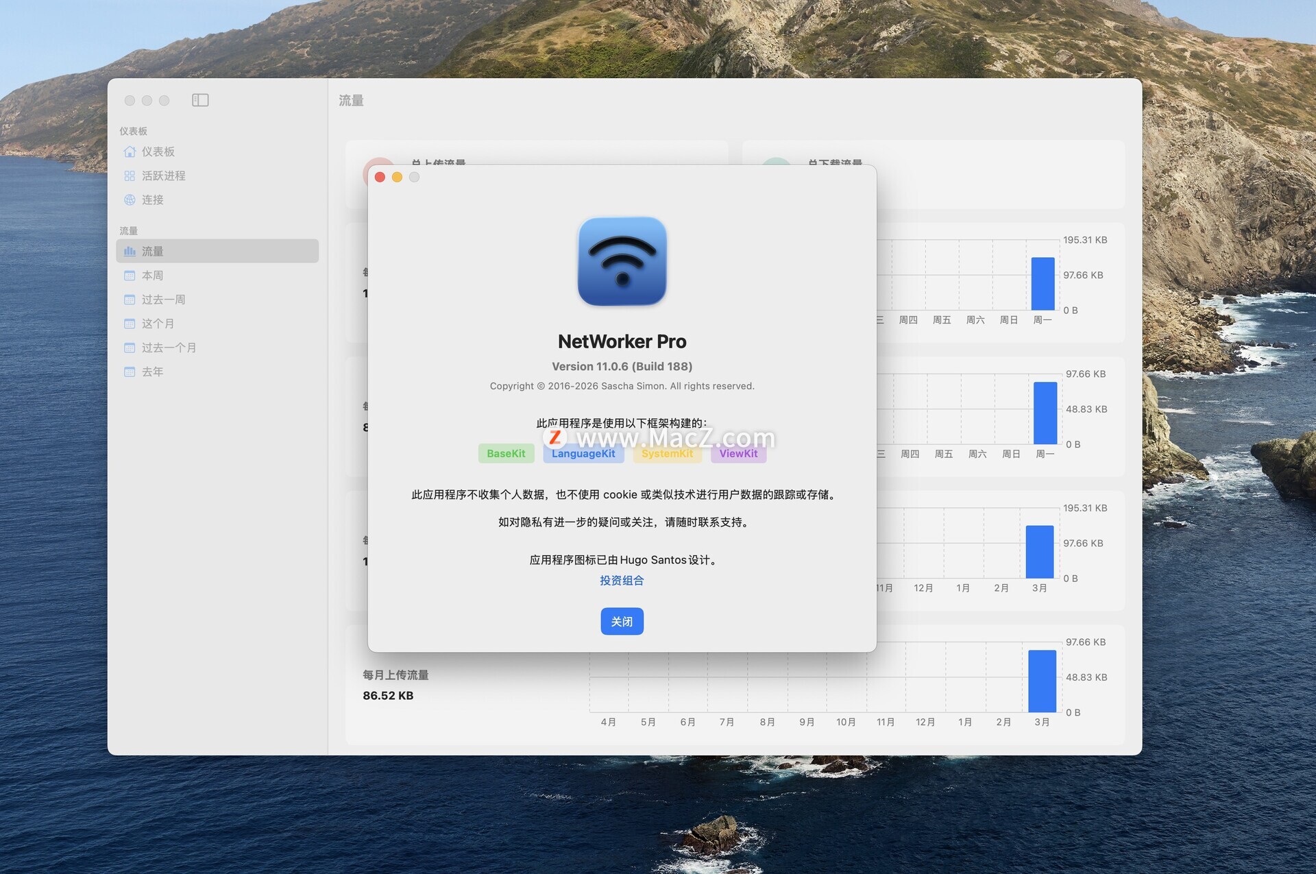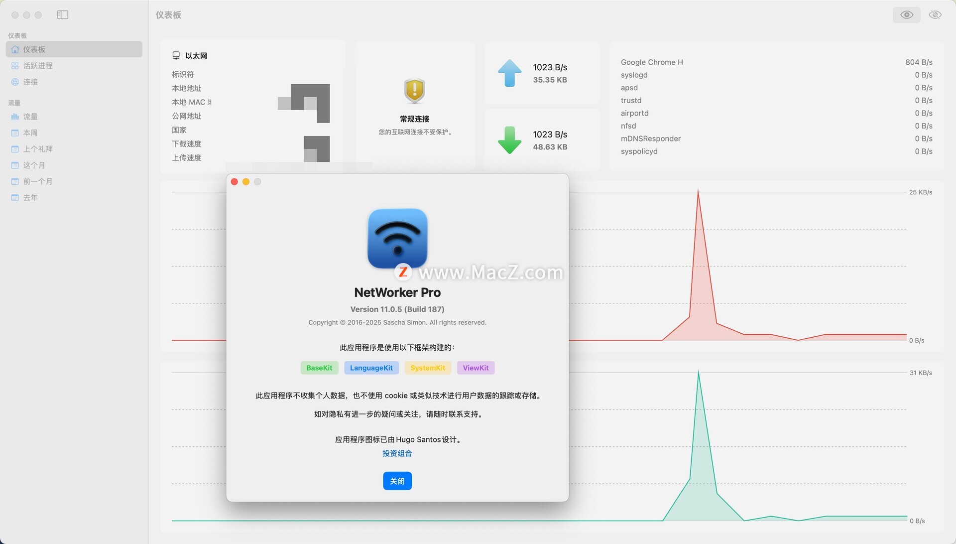 NetWorker Pro for Mac是一款功能强大的网络监控工具,适用于Mac操作系统。它允许用户准确获取网络速度、数据流量、连接数等关键信息,帮助用户开展网络管理和维护工作。此外,该软件提供流量图和统计图进行数据可视化,让用户一目了然地了解网络使用概况。NetWorker Pro for Mac还支持多种备份方式,如增量备份、完全备份等,确保数据安全。同时,它支持自定义报警设置,并通过邮箱或云平台提供报警信息,保障网络的安全和高效运行。测试环境:MacOS 15.5