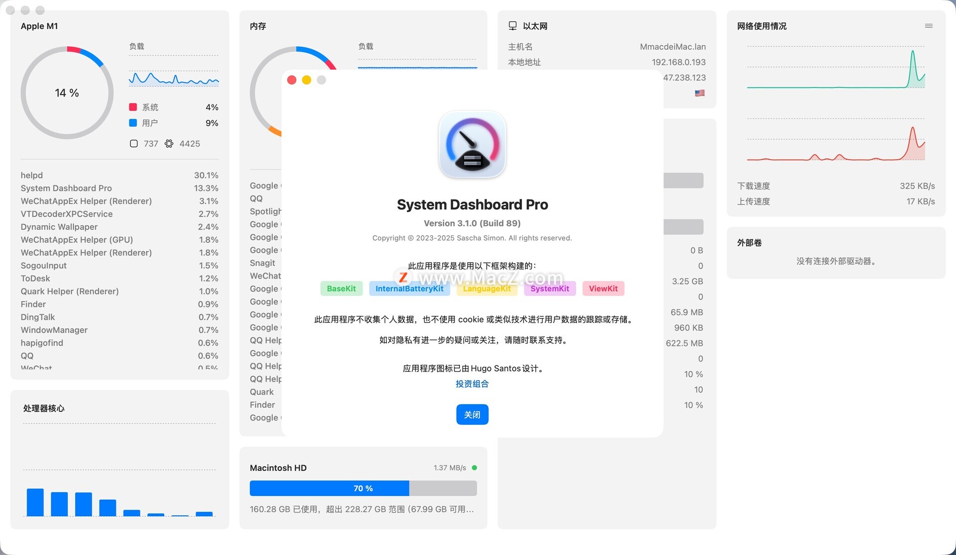 System Dashboard Pro for Mac是一款Mac OS X上的系统监控工具。它可以提供有关您的Mac及其硬件组件,如CPU、内存、磁盘使用情况、温度等的实时信息。此外,它还可以显示网络活动和应用程序行为,以便您可以更好地了解您的Mac正在运行什么和如何运行。