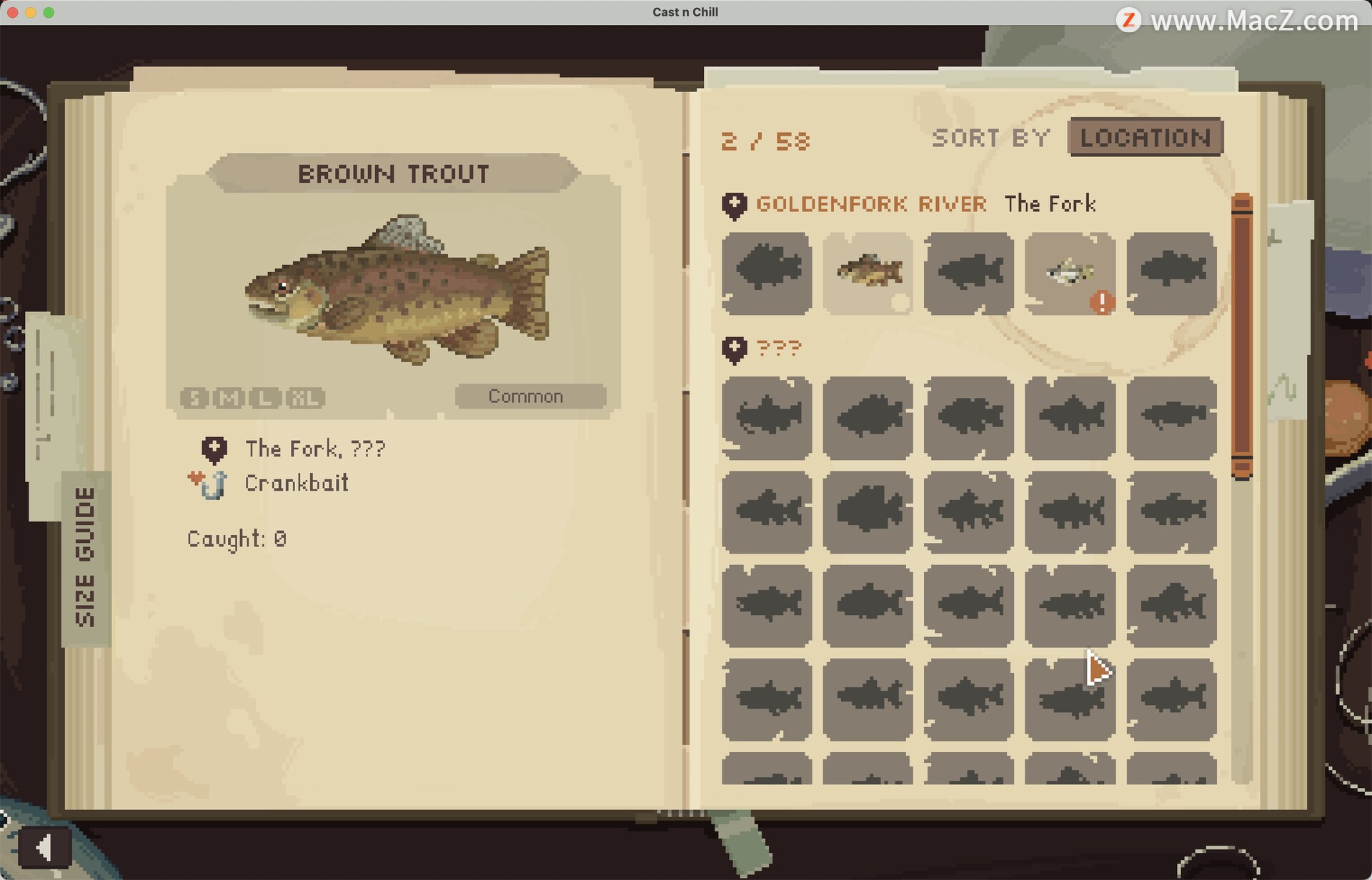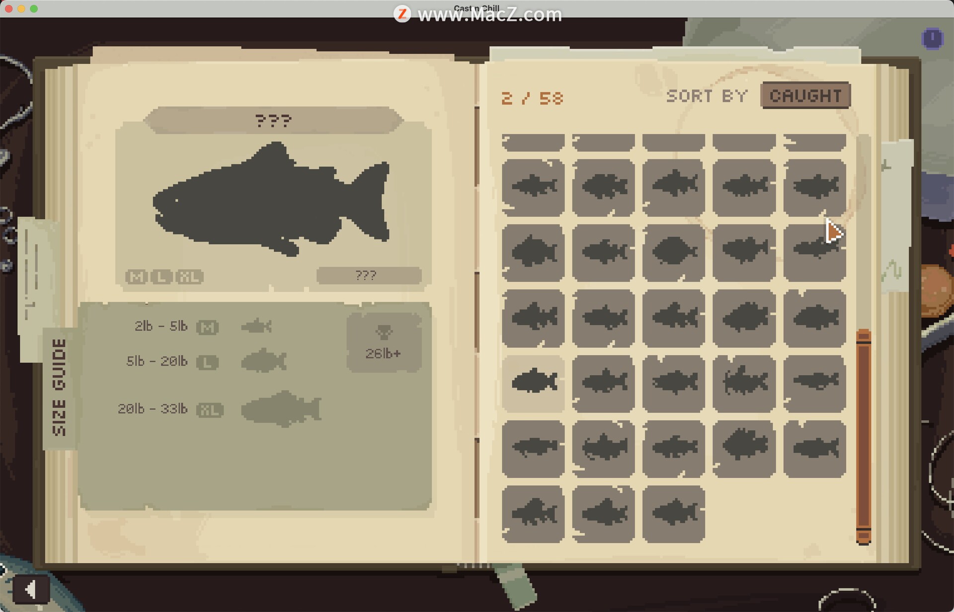 收集 50 种常见、稀有和传奇鱼类,包括咸水和淡水鱼类。