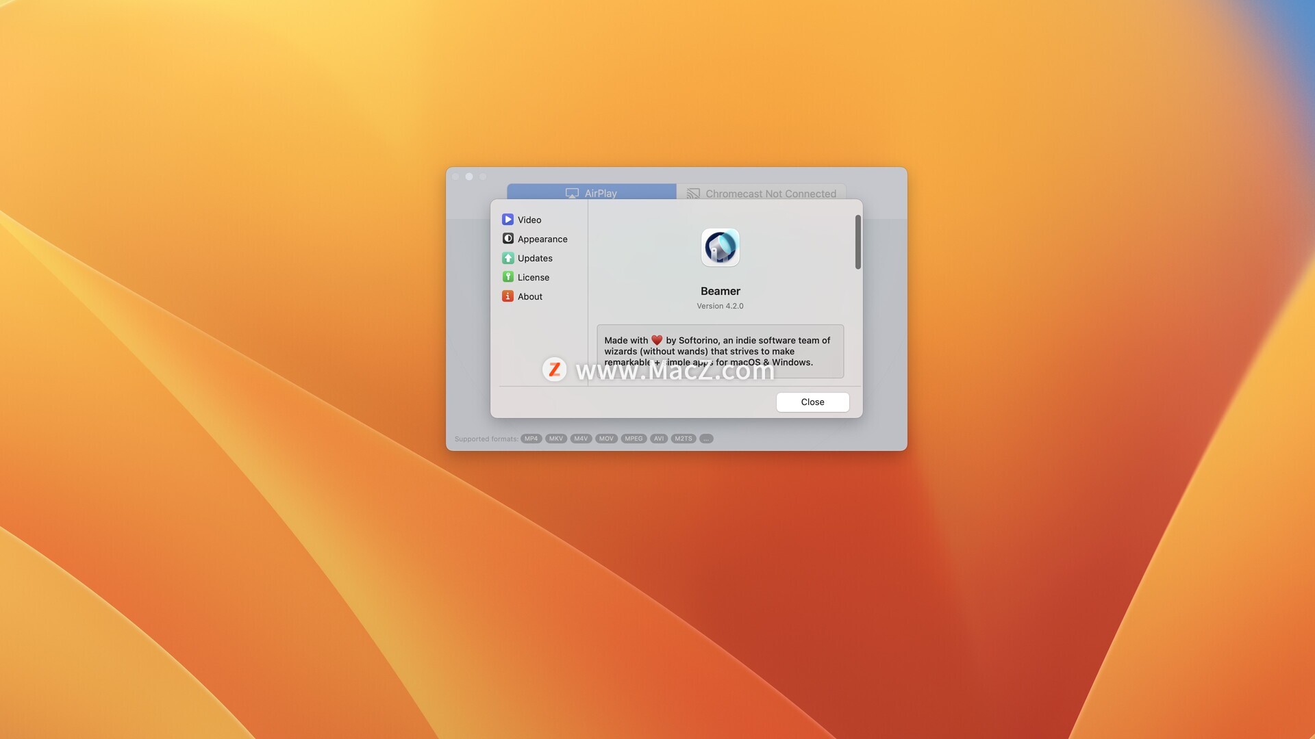 - 就像流行的桌面电影播放器,Beamer for Mac接受所有常见的格式,编解码器和决议。AVI,MKV,MOV,MP4,WMV,FLV,Beamer等等。
