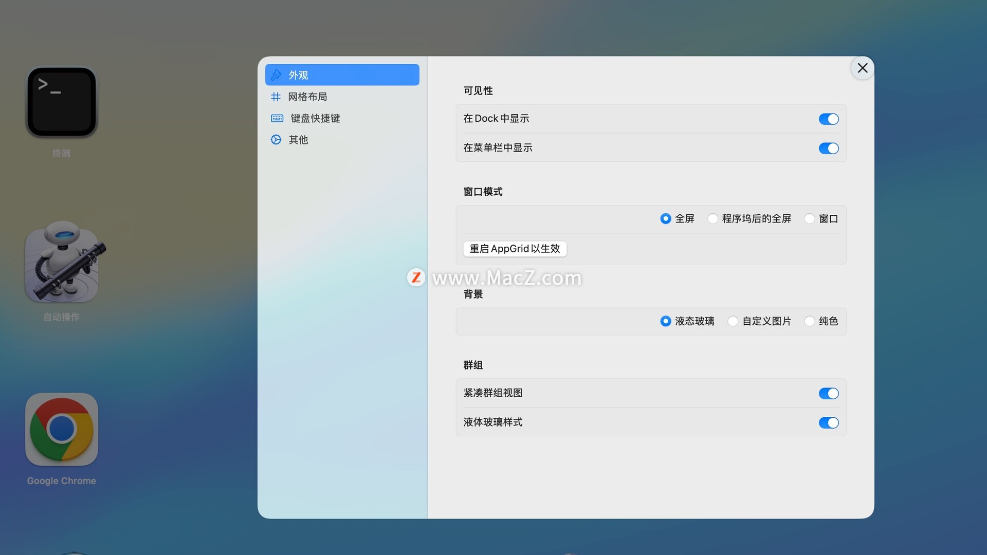 然后可以设置为全屏显示,这样就更加接近原生的启动台了。最后在勾选一下「在 Dock 中显示」即可